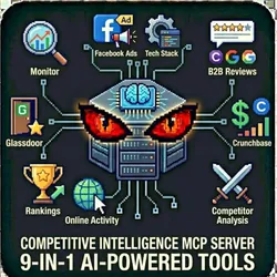 9-in-1 MCP server for AI-powered competitor analysis. Use with Claude, GPT or any AI assistant that supports MCP tools. This MCP server bundles 9 competitive intelligence tools into one endpoint. Monitor competitors Analyze Facebook Ads Detect tech stack Aggregate B2B review Research companies