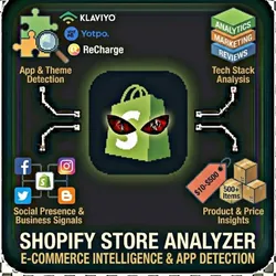 Analyze Shopify stores to detect installed apps, themes, and marketing technology. Competitive intelligence for e-commerce. App detection Theme identification Tech stack analysis Social presence Business signals Product insights