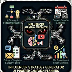 Generate comprehensive influencer marketing strategies using AI. Creates campaign plans, budget allocations, content calendars, outreach templates & ROI projections based on your goals AI-Powered Strategy Budget Optimization Content Calendar Outreach Templates ROI Projections Influencer Briefs