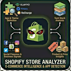 Analyze Shopify stores to detect installed apps, themes, and marketing technology. Competitive intelligence for e-commerce. App detection - Identify 40+ popular Shopify apps (Klaviyo, Yotpo, ReCharge, etc.) Theme identification Social presence Business signals Product insights