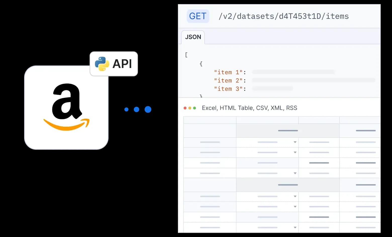 Getting started with our Amazon Python API is easy — simply create a free Apify account, get your API token, and start using the Amazon API in Python, JavaScript, CLI, cURL, OpenAPI, or MCP.P.