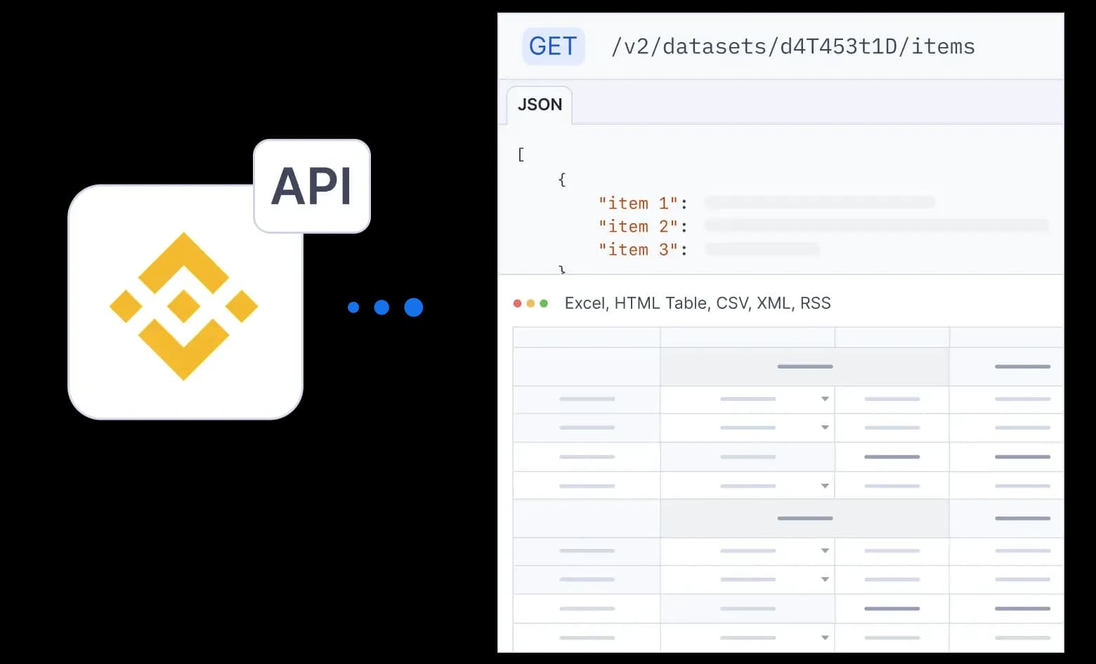 Access the Binance API using Python, JavaScript, CLI, cURL, OpenAPI, or MCP. Choose your preferred option and start extracting Binance data in minutes.