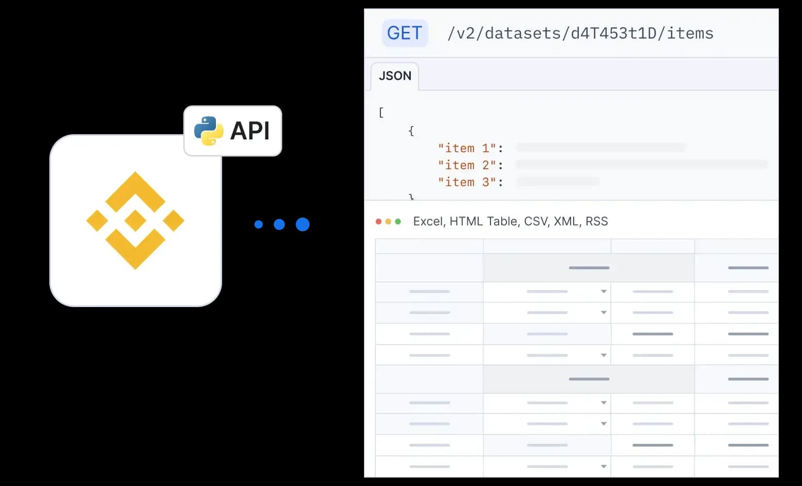Getting started with our Binance Python API is easy — simply create a free Apify account, get your API token, and start using the Binance API in Python, JavaScript, CLI, cURL, OpenAPI, or MCP.
