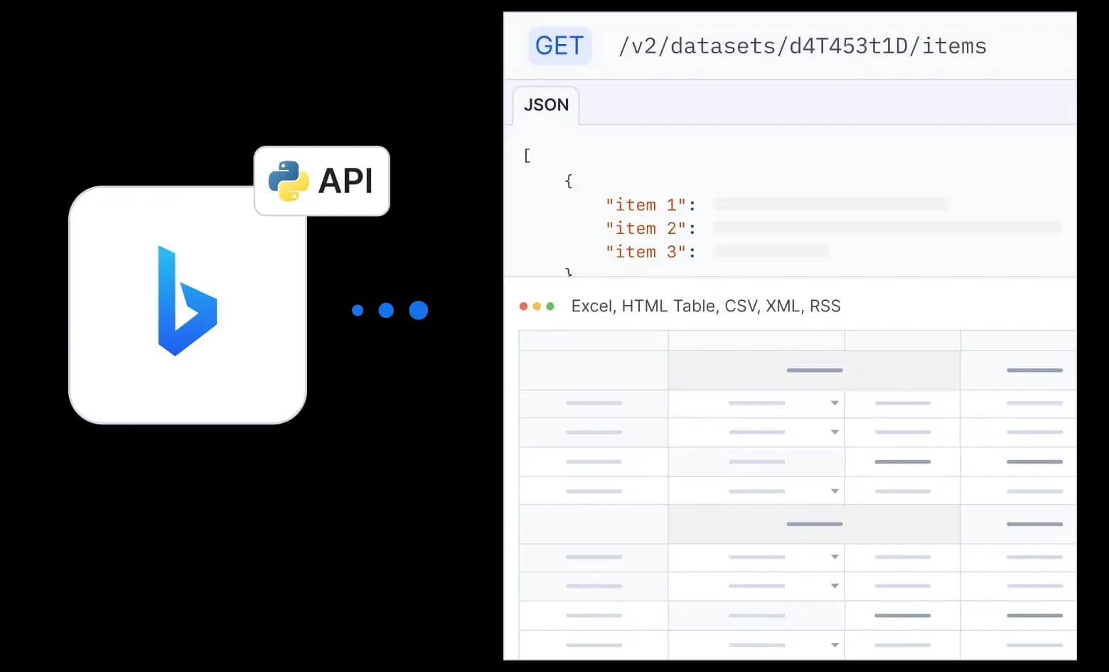 Getting started with our Bing Search Python API is easy — simply create a free Apify account, get your API token, and start using the Bing Search API in Python, JavaScript, CLI, cURL, OpenAPI, or MCP.