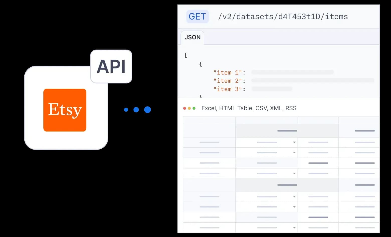 Our Etsy API gives you programmatic access to Etsy data that isn't available through any official API. Get data on Product details including images, seller information, pricing, variations, highlights, and more. And the best part? You can try the Etsy API entirely for free, no credit card required.