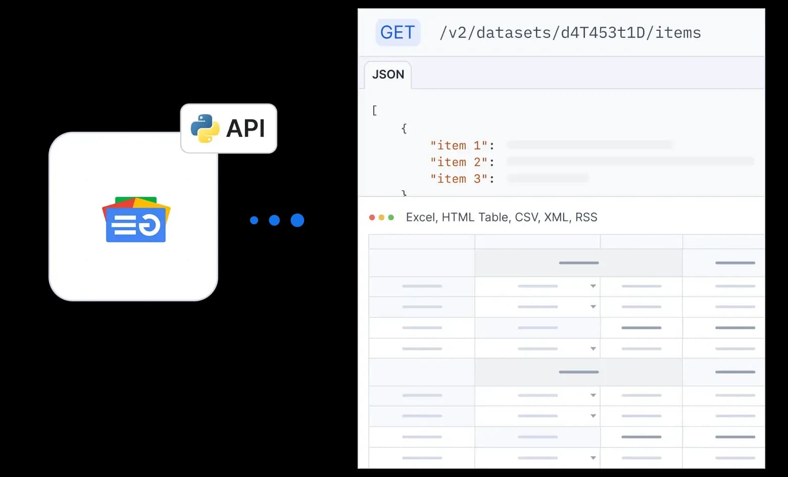 Your datasets can be exported to any format that suits your data workflow, including Excel, CSV, JSON, XML, HTML table, JSONL, and RSS.
