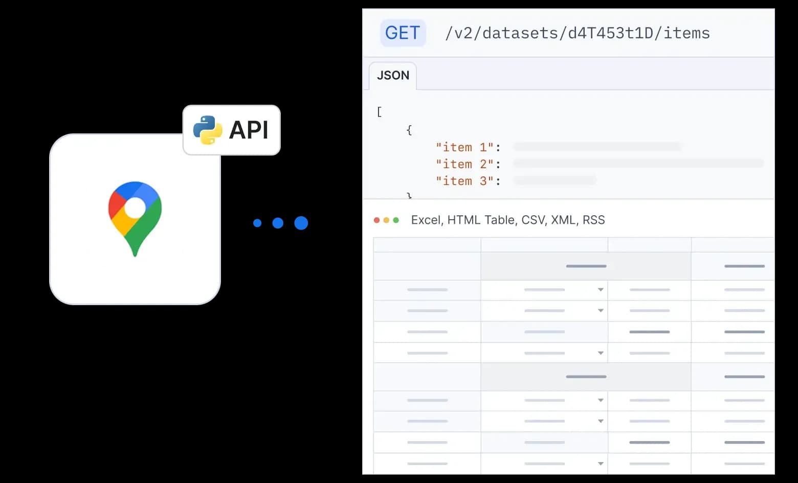 Use our Python API client to extract Google Maps business data by providing search terms, locations, or direct URLs. The API returns structured data, including contact details, ratings, reviews, coordinates, categories, opening hours, and 50+ other data points per business in JSON format.