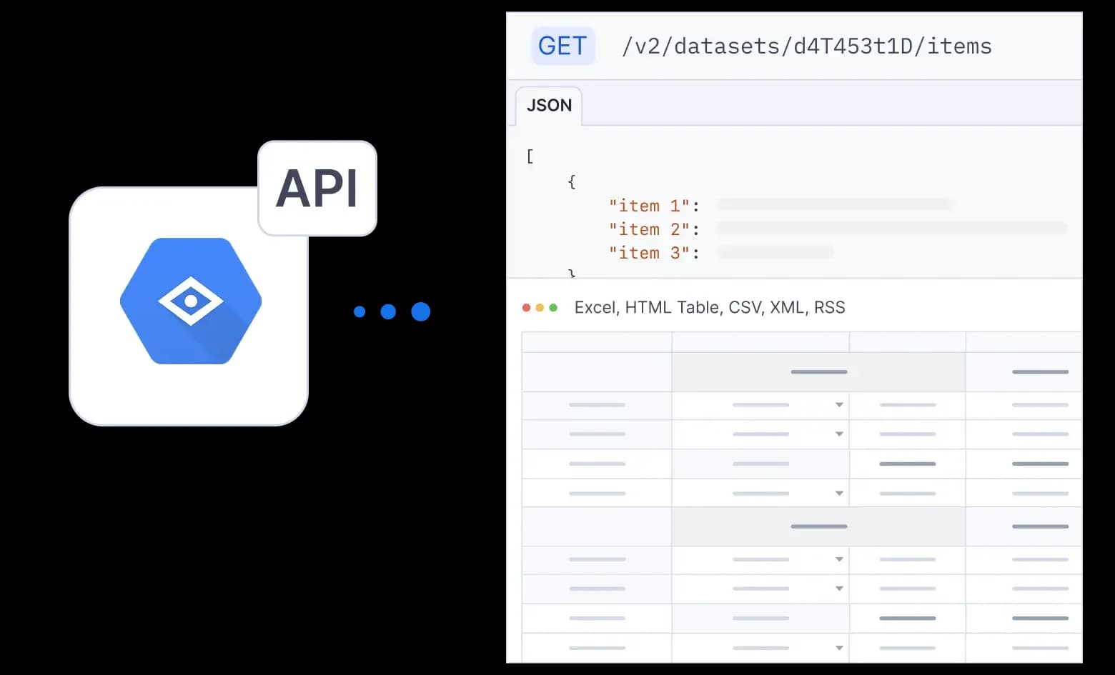 Your datasets can be exported to any format that suits your data workflow, including Excel, CSV, JSON, XML, HTML table, JSONL, and RSS.