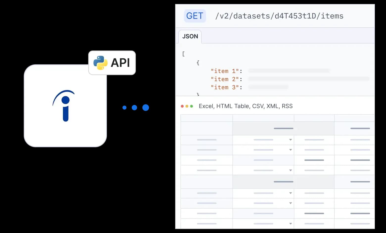 Your datasets can be exported to any format that suits your data workflow, including Excel, CSV, JSON, XML, HTML table, JSONL, and RSS.