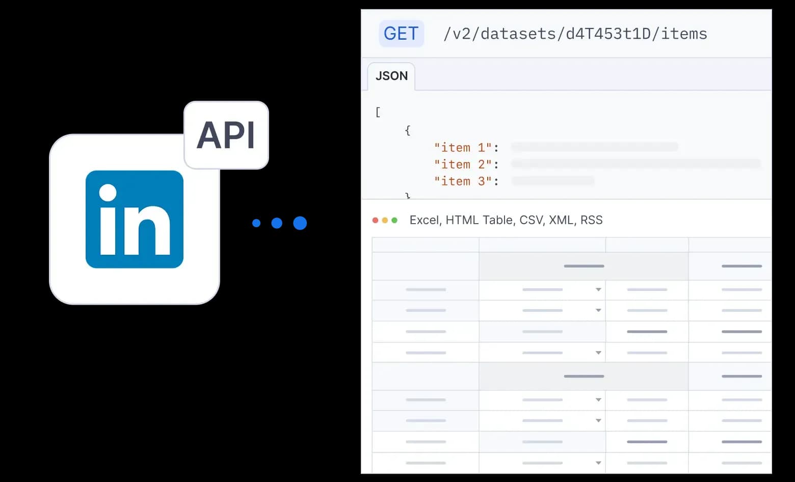 Your datasets can be exported to any format that suits your data workflow, including Excel, CSV, JSON, XML, HTML table, JSONL, and RSS.