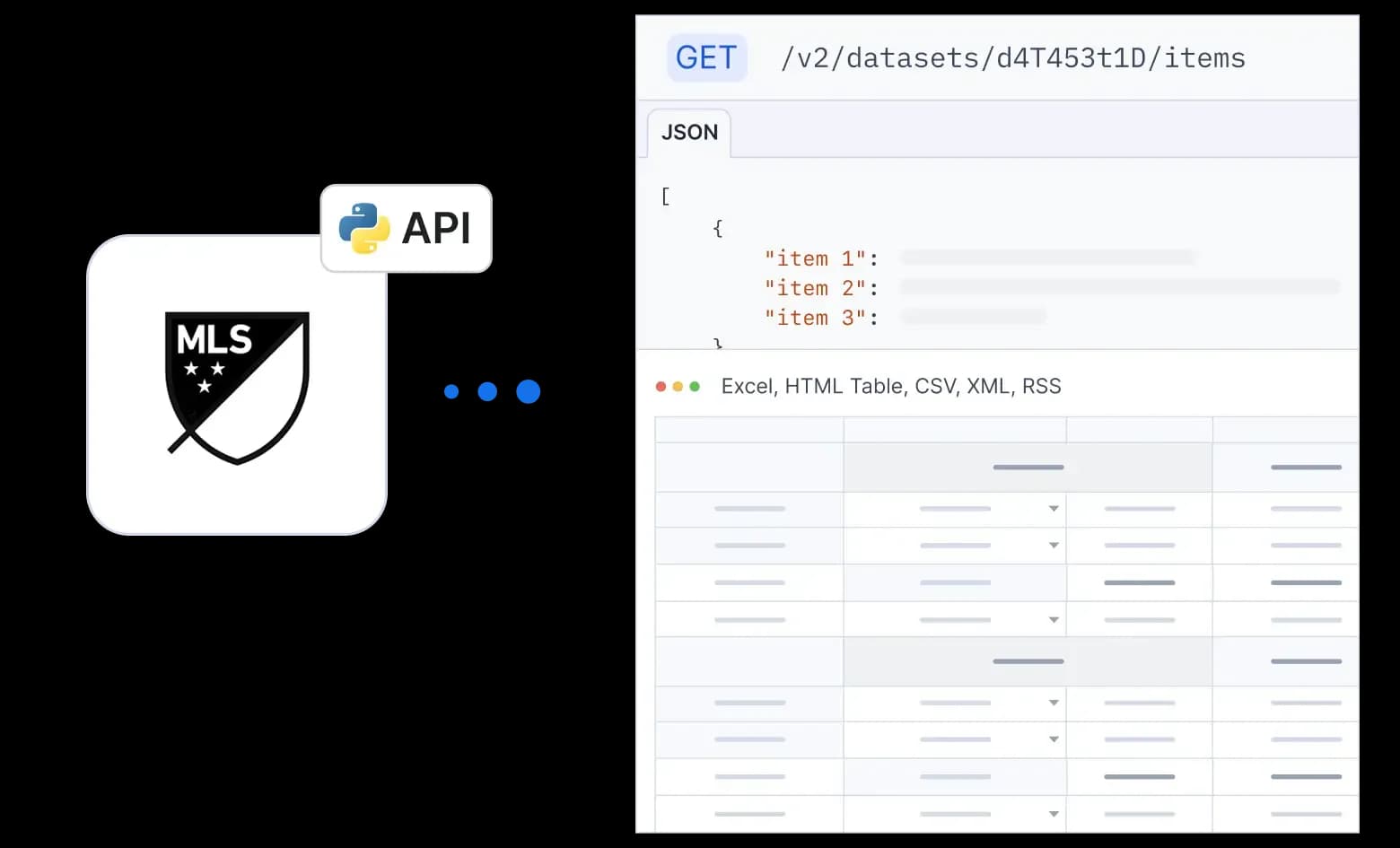 Extract MLS data with our MLS API Python client. Get programmatic access to GPS coordinates, structured JSON data, rent and sale offers, deduplication across platforms, Rightmove, Apartments.com, Zumper, Realtor, property listings from Zillow, and more using simple Python code. Start free, no credit card required.