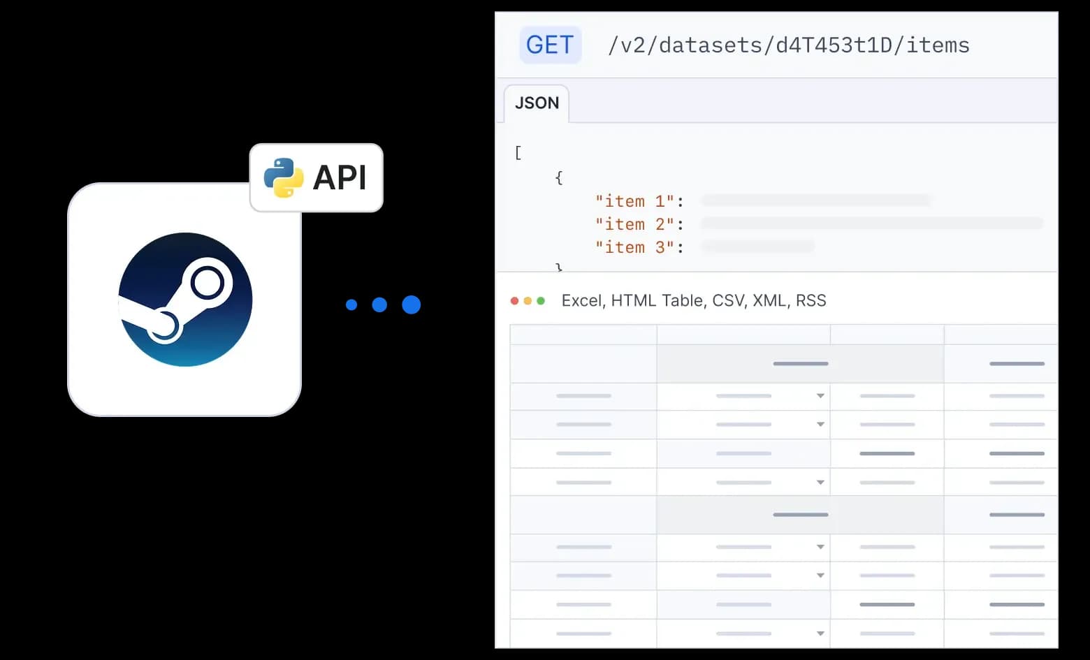 Extract Steam data with our Steam API Python client. Get programmatic access to recent and all reviews, supported languages, supported platforms, genres and popular tags, prices and deals, game information, and more using simple Python code. Start free, no credit card required.