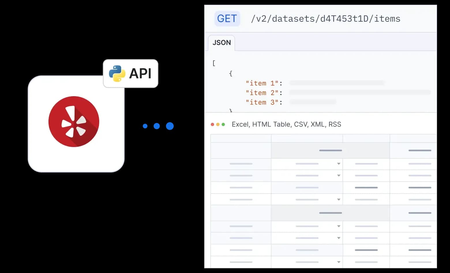 Extract Yelp data with our Yelp API Python client. Get programmatic access to photos, user collections, business information, event details, reviews, ratings, and more using simple Python code. Start free, no credit card required.