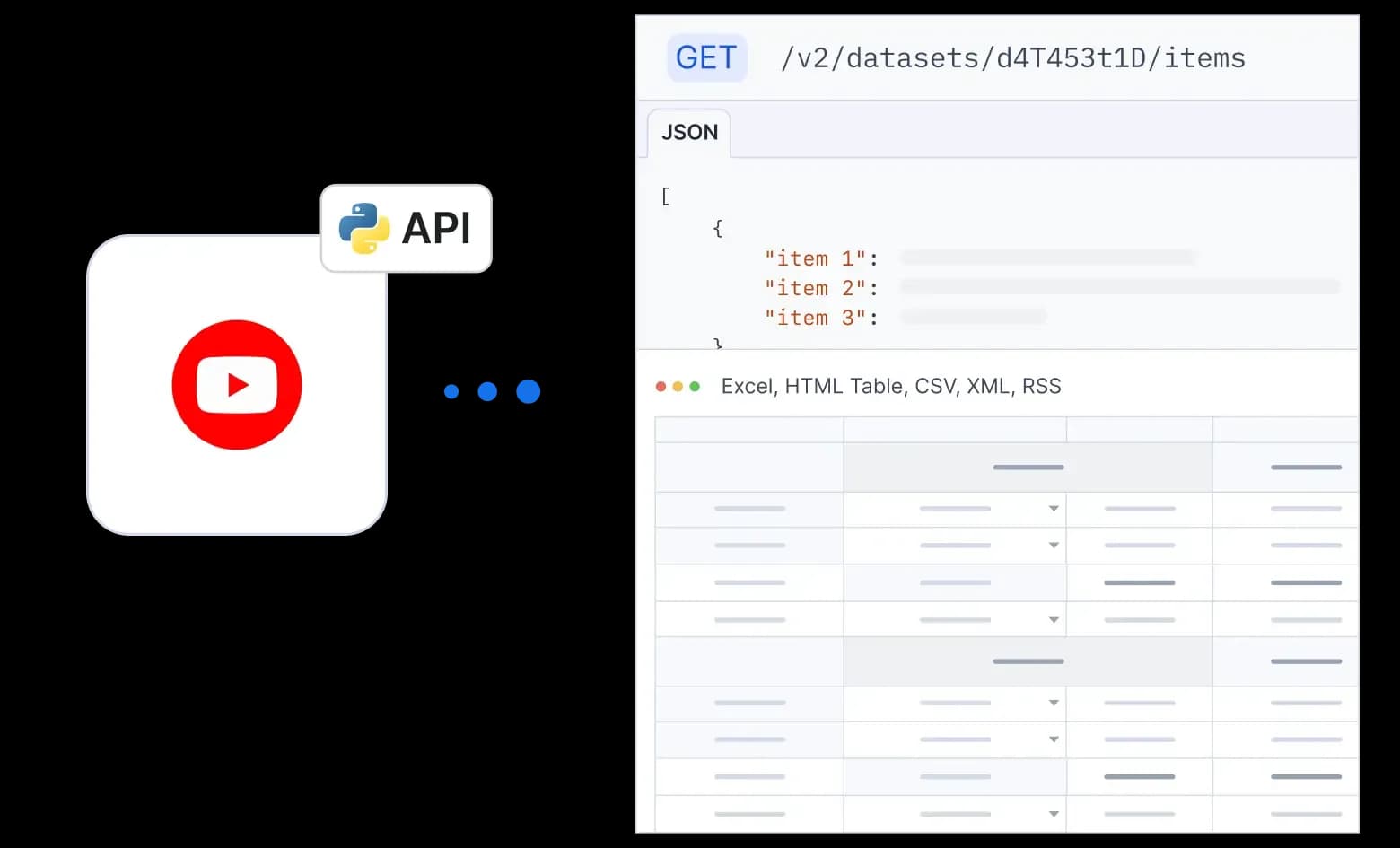 Extract YouTube data with our YouTube API Python client. Get programmatic access to comments data, channel information, video titles, descriptions, view counts, subscriber numbers, and more using simple Python code. Start free, no credit card required.