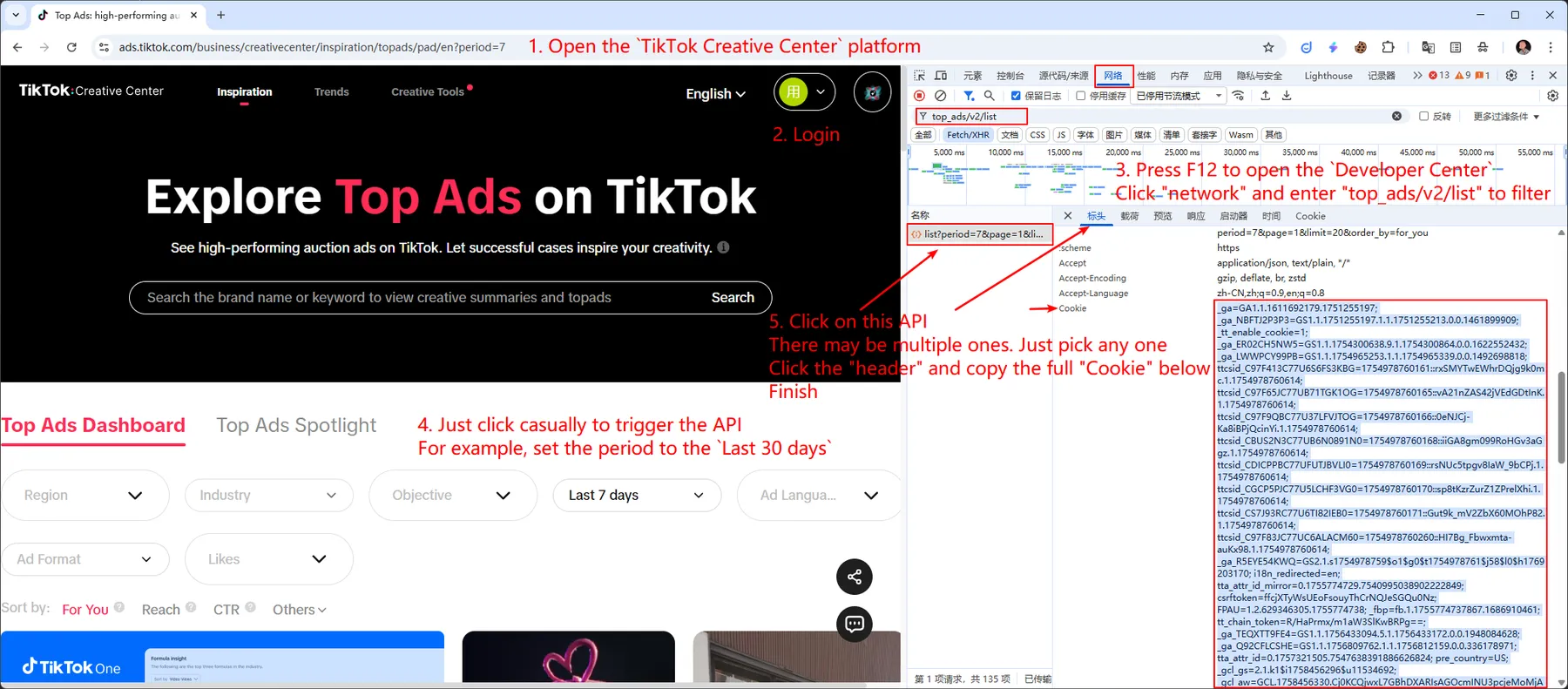 : (Required) Your authentication cookie after logging into the TikTok Creative Center platform. Way to obtain:
