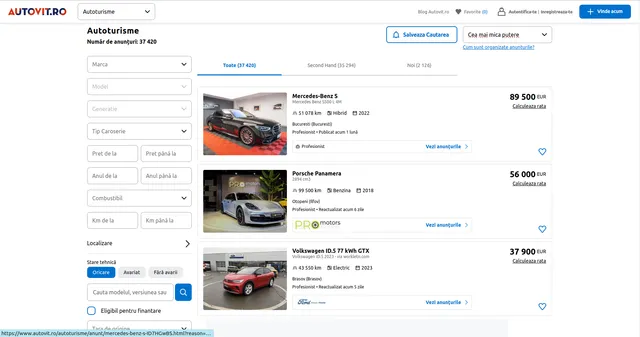 Navigate to Autovit.ro and construct your desired search using filters for make, model, price range, year, location, and other criteria. Copy the resulting URL into the urls array. This method is ideal when you have specific searches already configured on the platform.