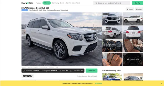 [{"id": "rJMBnxVE","submission_id": "3pOJpeOW","seller": {"photo": null,"username": "buyfromme74","is_followed": false},"stats": {"bids": 28,"comments": 10,"questions": 7,"watchers": 495,"auction_end": "2026-01-16T20:24:00.000+00:00","current_bid": {"bidder": {"photo": null,"username": "vectorw2"},"amount": 18018},"sale_amount": null},"watching": false,"make_saved_search": null,"model_saved_search": null,"no_reserve": true,"canceled_message": null,"listing": {"title": "2017 Mercedes-Benz GLS 550","sub_title": "Twin-Turbo V8, AWD, Driver Assistance Package, Unmodified","model": "GLS-Class","make": "Mercedes-Benz","year": 2017,"location": "Lima, OH 45807","vin": "4JGDF7DE0HA853983","mileage": 76200,"mileage_text": null,"body_style": 5,"engine": "4.7L Turbocharged V8","drive_train": 3,"transmission": 1,"transmission_details": "9-Speed","exterior_color": "Diamond White Metallic","interior_color": "Saddle Brown","title_status": "Clean (OH)","seller_type": 1,"seller_type_details": null,"highlighted_points": ["Accident-free Carfax history report","21-inch AMG wheels","Saddle Brown interior"],"history_report_pdf": null,"history_report": {"url": "https://www.carfax.com/vehiclehistory/ar20/Fkw-Hv4M1Qz_B-fS0VJ94rWo9-go-gjfk131LE21lzTHkTzyi5xnOIUHJCaz4tG9tDcSzn4mk3a0PTxcMfB6u5E0mUadNJ_Me6UQ49CR","expiry": "2026-06-05T18:57:20.000+00:00","vendor": "carfax"},"sections": {"doug": "The X166 Mercedes-Benz GLS 550 is an excellent full-size SUV that boasts a powerful twin-turbo V8, all-wheel drive, and a spacious interior. This particular example touts a classy color combination and some great factory equipment – including the Driver Assistance Package, 21-inch AMG wheels, and heated and ventilated front seats. Plus, this GLS 550 comes with no modifications along with a clean, accident-free `Carfax` report – AND it's offered with the thrill of no reserve!","videos": ["35Rq0bQR","3oOjYleg","Kmo4G7O0","KdEqlGwL","365P54n9","9AJQ4okz"],"equipment": "A build sheet is provided in the photo gallery, and a partial list of notable equipment reported by the seller includes:\n- Driver Assistance Package (Distronic Plus adaptive cruise control with Steering Pilot, Active Brake Assist with cross-traffic function, Pre-Safe Plus with rear collision detection and preparation, Active Blind Spot Assist, Active Lane Keeping Assist, Speed Limit Assist)\n- 21-inch AMG wheels\n- Airmatic air suspension with Adaptive Damping System (ADS)\n- Panoramic sunroof\n- Leather upholstery\n- Heated and ventilated front seats\n- Power-folding third-row seats\n- 3-zone automatic climate control\n- Surround View camera","highlights": "THIS... is a 2017 Mercedes-Benz GLS 550, finished in Diamond White Metallic with a Saddle Brown interior.\n- The attached `Carfax` history report lists no accidents or mileage discrepancies in this GLS 550's past.\n- According to the build sheet provided in the gallery, notable factory equipment includes the Driver Assistance Package, 21-inch AMG wheels, a panoramic sunroof, heated and ventilated front seats, and power-folding third-row seats. The seller reports no notable modifications.\n- The GLS was introduced for 2017 as a replacement for the outgoing GL-class of three-row SUVs, with Mercedes-Benz calling it \"the S-Class among SUVs\". Along with a redesigned interior, the model received a retuned air suspension and a larger, standalone 8-inch COMAND multimedia screen.\n- Power comes from a 4.7-liter twin-turbocharged V8, rated at 449 horsepower and 516 lb-ft of torque. Output is sent to all four wheels via a 9-speed automatic transmission and Mercedes-Benz's 4Matic permanent all-wheel drive system.","known_flaws": "- Chips and scratches around the exterior (some are touched-up)\n- Scratches on wheels\n- Some wear on seats and interior touch points","other_items": "- 1 key\n- Owner's manual\n- WeatherTech floor mats and cargo mat","seller_notes": "There is a loan on this vehicle, and sale proceeds will be used to satisfy the loan. We recommend handling the loan payoff securely through [Cars & Bids SafePay](https://carsandbids.com/safepay/) if agreed to by both the buyer and the seller. Please note that the title may only be available **after** the loan has been paid off.","ownership_history": "The seller reportedly purchased this GLS 550 in May 2025. ","recent_service_history": "Service documentation in the photo gallery indicates that the following maintenance has been performed:\n- September 2025 (73,385 miles): Engine oil and filter changed, driver-side upper control arm, cabin air filter, coolant hose, and turbocharger coolant hose replaced, brake fluid flushed\n\nThe attached `Carfax` history report shows that the following services have been performed:\n- June 2025: Glass repaired\n- May 2025: Engine oil and filter changed\n- December 2024 (68,696 miles): Recommended maintenance performed\n\nThe seller reports that the following services have been performed:\n- May 2025: Tires replaced\n\nAdditional service history is detailed in the attached `Carfax` report."},"featured": false,"accepts_usdc": false,"safepay_eligible": true,"id": "rwnzMm65","inspection_report_url": null,"photos": {"base_url": "media.carsandbids.com","docs": [{"id": "30AY4jwM","link": "9004500a220bf3a3d455d15ee052cf8c332606f8/photos/3pOJpeOW-uolELDIhUG.jpg?t=176776416784","width": 1240,"height": 1754},{"id": "9eG6Gmb6","link": "9004500a220bf3a3d455d15ee052cf8c332606f8/photos/3pOJpeOW-wy-qQihV13.jpg?t=176776416784","width": 1240,"height": 1754},{"id": "925aABP4","link": "9004500a220bf3a3d455d15ee052cf8c332606f8/photos/3pOJpeOW-gwOTp3G-42.jpg?t=176776416784","width": 1240,"height": 1754},{"id": "3yMNYMzM","link": "9004500a220bf3a3d455d15ee052cf8c332606f8/photos/other/3pOJpeOW-gFwrH-V/edit/Lbgo8.jpg?t=176776410817","width": 3072,"height": 4080}],"other": [{"id": "rkbXP1ng","link": "a04589c70a57e45f6dc2dd571e9b186ce5d54fa7/photos/interior/3pOJpeOW-q8bih1Z.jpg?t=176771883232","width": 4080,"height": 3072},{"id": "3q2Xe6xy","link": "a