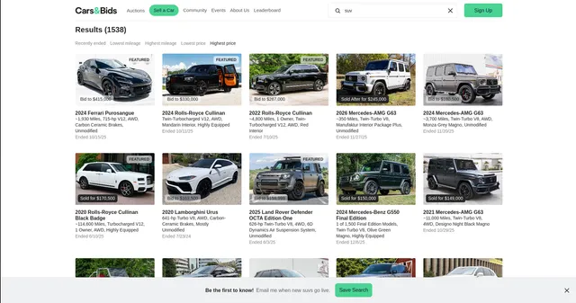 Example url 1: https://carsandbids.com/search?q=suv&csort=10&ss_id=73f6afa2-f61e-4893-bd3c-613aecfa3742