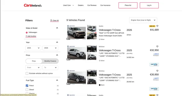 Example url 3: https://www.carsireland.ie/search?sort=EngineSizeAsc&keywords=suv&makeModelSearch=Volkswagen&minYear=2025&maxYear=2026&FuelType=Petrol