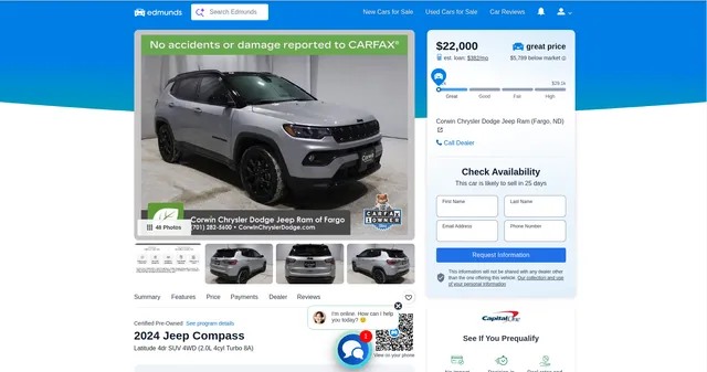 [{"third_party_info": {"price_validation": {"list_price_estimate": 27789,"list_price_estimate_national": 27917,"deal_type": "Great","max_great_price": 25307,"max_good_price": 26657,"max_fair_price": 28765,"deal_type_national": "Great","max_great_price_national": 25058,"max_good_price_national": 26340,"max_fair_price_national": 28897},"recurrent_insights": {"expected_range": {}}},"vid": "37366d50ace03afe20f26701c36d2d60","vin": "3C4NJDBN4RT587869","stock_number": "4587869","type": "CPO","sellers_comments": "HAPPY NEW YEARS FROM CORWIN CHRYSLER DODGE JEEP RAM OF FARGO!! WE HAVE SAVINGS ON ALL OF OUR PRE-OWNED VEHICLES AVAILABLE!! WE HAVE ONE OF THE LARGEST SELECTION OF INVENTORIES IN OUR AREA AT ONE SINGLE LOCATION!! Recent Arrival! Priced below KBB Fair Purchase Price! Silver 2024 Jeep Compass Latitude 4D Sport Utility 4WD 2.0L I4 DOHC CARFAX One-Owner. Clean CARFAX.\n\nThis Jeep Compass is well equipped and includes these key features and benefits, Heated Seats, Touchscreen Controls, Backup Camera, Automatic Headlights, Bluetooth Handsfree, AWD / 4x4 / Four Wheel, 2nd Row USB Type A/C Charge Only, Air Conditioning ATC w/Dual Zone Control, All-Season Floor Mats, Altitude Special Edition, Auto-Dimming Rear-View Mirror, Black Day Light Opening Moldings, Black Roof, Convenience Group, Foot Activated Open 'N Go Liftgate, Fully automatic headlights, Gloss Black Surround/Neutral Gray Rings, Heated Front Seats, Heated Steering Wheel, Humidity Sensor, Light Tungsten Interior Accent Stitching, Neutral Gray Exterior Badging, ParkView Rear Back-Up Camera, Piano Black Interior Accents, Power 2-Way Driver Lumbar Adjust, Power Front/Fixed Rear Full Sunroof, Power Liftgate, Premium Alpine Speaker System, Remote Start System, Reversible Carpet/Vinyl Cargo Mat, Sliding Sun Visors w/Illuminated Mirrors, Sun and Sound Group, Universal Garage Door Opener, Wheels: 18\" x 7\" Gloss Black Painted Aluminum, Windshield Wiper De-Icer. Odometer is 19021 miles below market average! 24/32 City/Highway MPG\n\n\nCorwin is the largest Chrysler Dodge Jeep Ram dealer in the region! We have a huge selection of new & used vehicles with financing options for everyone. Here at Corwin Chrysler Dodge Jeep Ram we're not only here to help you find your next car, we are your go-to source for all things automotive! Our expert dealership staff is here to help you with auto financing, car maintenance and repairs, or even finding the right parts for your next DIY project. Stop by our new and used car dealership in Fargo today and find out why folks keep coming back! We're here to help you get into the vehicle of your dreams and keep it running its best for many miles. Corwin Chrysler Dodge Jeep Ram 301 38th St S, Fargo, North Dakota CorwinChryslerDodge.com Corwin - Family Driven for Over 100 YearS.","publish_date": 1767881942121,"first_published_date": 1767218722000,"listing_url": "https://www.corwinauto.com/used/Jeep/2024-Jeep-Compass-7290720bac181d308972908b5f385be0.htm","incentives": {},"in_transit": false,"editorial_info": null,"is_private_party": null,"dealer_info": {"address": {"city": "Fargo","state_code": "ND","state_name": "North Dakota","street": "301 38th St S","zip": "58103"},"display_info": {"parent_dealership_name": "Corwin Automotive Family"},"distance": 64.59402292517322,"franchise_id": "749075","location": {"lat": 46.871716,"lon": -96.84216},"name": "Corwin Chrysler Dodge Jeep Ram","partner_code": "VAUTO","product_features": {"direct_dealer": true,"digital_retail": {"credit": {"provider": "CapitalOne"},"lease": {},"loan": {"program": "free"}}},"rooftop_id": 10957,"rooftop_logical_name": "CorwinChryslerDodgeJeepRam","phone_numbers": {"basic": {"area_code": "701","prefix": "712","postfix": "9321"},"trackable": {"area_code": "218","prefix": "422","postfix": "3231"}}},"prices": {"display_price": 22000,"doc_fee": 299,"price_promise": {"purchase_promise_disclaimer": "Price excludes all federal, state and local taxes, and all title, license and registration fees. Dealer is under no obligation to include or offer any additional equipment, products or services."},"used_plus": {},"guaranteed_price_delta": 0,"base_msrp": 32670,"total_msrp": 42110,"destination_fee": 1595,"loan": {"payment": 380.64},"has_incentives_disabled": false,"advertised_price": 22000,"advertised_price_source": "internetPrice","dealer_msrp": 0,"edmunds_suggested_price_is_compliant": false,"destination_fee_is_compliant": true,"dealer_msrp_strikethrough_is_compliant": false,"historical_prices_is_compliant": true,"incentives_data_is_compliant": false,"deal_rating_is_compliant": true,"discount_price_is_compliant": true},"vehicle_info": {"mileage": 12105,"parts_info": {"drive_train": "four wheel drive","cylinders": 4,"engine_size": 2,"engine_type": "gas","fuel_type": "regular unleaded","non_color_option_ids": [402010041,402009705,402009676,402009830,402009703],"options": [{"id": 402010041,"name": "Black"},{"id": 402009705,"name": "Convenience Group"},{"id": 402009676,"name": "Front License Plate Bracket"},{"id": 402009830,"name": "Altitude Special Edition"},{"id": 402009703,"name": "Sun and Sound Group"}],"transmission": "Automatic","transmission_info": {"type": "Automatic","speed": "8","name": "8A"},"engine_power": 200,"doors": 4,"option_descriptions": ["Piano Black Interior Accents","Front fog lights","Outside temperature display","Front reading lights","4-Wheel Disc Brakes","Rear anti-roll bar","Auto High-beam Headlights","Overhead airbag","Leather Shift Knob","Remote keyless entry","Humidity Sensor","Power steering","Power door mirrors","Rear seat center armrest","Tachometer","Four wheel independent suspension","AM/FM radio: SiriusXM","Front anti-roll bar","Heated Seats","Sun and Sound Group","Premium Alpine Speaker System","Foot Activated Open 'N Go Liftgate","Power windows","3.73 Final Drive Ratio","Speed control","Neutral Gray Exterior Badging","Universal Garage Door Opener","Steering wheel mounted audio controls","Auto-Dimming Rear-View Mirror","Air Condi