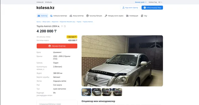 Kolesa.kz stands as Kazakhstan's premier online automotive marketplace, serving as the primary platform for buying and selling vehicles throughout the country. With hundreds of thousands of active listings, Kolesa.kz provides detailed information about new and used vehicles including specifications, pricing, seller details, financing options, and comprehensive photo galleries.