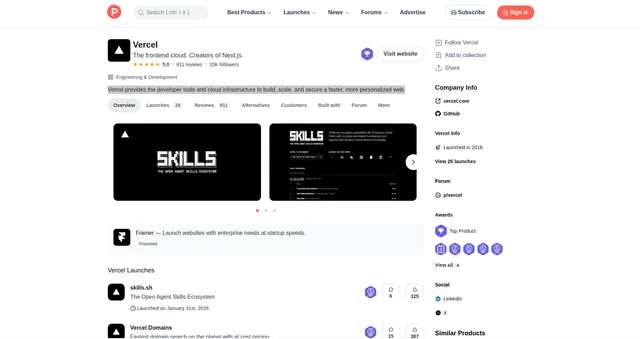 [{"id": "435808","can_edit": false,"upcoming_launch": null,"structured_data": {"@context": "http://schema.org","@id": "https://www.producthunt.com/products/vercel","@type": ["WebApplication","Product"],"url": "https://www.producthunt.com/products/vercel","name": "Vercel","description": "Vercel provides the developer tools and cloud infrastructure to build, scale, and secure a faster, more personalized web.","date_published": "2022-04-14T07:51:27.719-07:00","date_modified": "2026-04-09T02:32:44.977-07:00","image": "https://ph-files.imgix.net/593ff5e2-9d11-491c-ab63-9e929e894214.jpeg?auto=format","screenshot": ["https://ph-files.imgix.net/be9e05c1-ffed-4d8c-9817-456df32b6b68.jpeg?auto=format&fit=crop","https://ph-files.imgix.net/43dae3cc-0260-483e-80a8-14302c37e434.png?auto=format&fit=crop","https://ph-files.imgix.net/32e0daf6-84d3-44e4-9329-4204416f76fa.png?auto=format&fit=crop"],"aggregate_rating": {"@type": "AggregateRating","rating_count": 811,"rating_value": "4.96","worst_rating": 1,"best_rating": 5},"operating_system": "Web","application_category": "Software Engineering","author": [{"@type": "Person","name": "Mark Glagola","image": "https://ph-avatars.imgix.net/954059/original.jpeg?auto=format&crop=faces&fit=crop&h=100&w=100","url": "https://www.producthunt.com/@markgl"},{"@type": "Person","name": "Rhys Sullivan","image": "https://ph-avatars.imgix.net/4511796/0aa08e05-df9c-476e-9e50-8d0a294e6b2c.png?auto=format&crop=faces&fit=crop&h=100&w=100","url": "https://www.producthunt.com/@rhyssullivan"},{"@type": "Person","name": "Dillon Mulroy","image": "https://ph-avatars.imgix.net/7587116/original.jpeg?auto=format&crop=faces&fit=crop&h=100&w=100","url": "https://www.producthunt.com/@dillon_mulroy"}]},"latest_launch": {"__typename": "Post","id": "1070427","launched_this_week": false,"slug": "skills-sh","product": {"__typename": "Product","id": "435808","slug": "vercel","name": "Vercel","can_edit": false,"website_url": "https://vercel.com","website_domain": "vercel.com","is_claimed": true,"can_claim": false,"is_viewer_team_member": null,"viewer_pending_team_request": null,"tagline": "The frontend cloud. Creators of Next.js. ","clean_url": "vercel.com","logo_uuid": "593ff5e2-9d11-491c-ab63-9e929e894214.jpeg","is_no_longer_online": false},"launch_state": "featured","can_manage": false,"moderation_reason": null,"name": "skills.sh","created_at": "2026-01-31T00:01:00-08:00","scheduled_at": "2026-01-31T00:01:00-08:00","is_maker": false,"is_hunter": false,"launching_today": false,"launch_number": 26,"can_deputy_manage": false,"primary_link": {"__typename": "ProductLink","id": "1370923","url": "https://skills.sh/"},"tagline": "The Open Agent Skills Ecosystem","thumbnail_image_uuid": "593ff5e2-9d11-491c-ab63-9e929e894214.jpeg","product_state": "default"},"name": "Vercel","tagline": "The frontend cloud. Creators of Next.js. ","description": "Vercel provides the developer tools and cloud infrastructure to build, scale, and secure a faster, more personalized web.","reviews_count": 811,"followers_count": 10117,"is_top_product": true,"founder_detailed_reviews_count": 768,"first_launch": false,"golden_kitty_badges": {"__typename": "GoldenKittyAwardBadgeConnection","edges": []},"orbit_award_badges": {"__typename": "OrbitAwardBadgeConnection","edges": []},"slug": "vercel","twitter_url": "https://x.com/vercel","facebook_url": "","instagram_url": "","linkedin_url": "https://www.linkedin.com/company/vercel/","angellist_url": "","threads_url": "","medium_url": "","awards": {"__typename": "Connection","edges": [{"__typename": "BadgeEdge","node": {"__typename": "TopPostBadge","id": "9559","post": {"__typename": "Post","id": "124616","slug": "hyper-2-2","name": "Hyper 2","product": {"__typename": "Product","id": "435808","slug": "vercel"},"redirect_to_product": {"__typename": "Product","id": "435808","slug": "vercel"}},"position": 3,"period": "weekly","date": "2018-04-17"}},{"__typename": "BadgeEdge","node": {"__typename": "TopPostBadge","id": "9523","post": {"__typename": "Post","id": "124616","slug": "hyper-2-2","name": "Hyper 2","product": {"__typename": "Product","id": "435808","slug": "vercel"},"redirect_to_product": {"__typename": "Product","id": "435808","slug": "vercel"}},"position": 2,"period": "daily","date": "2018-04-17"}},{"__typename": "BadgeEdge","node": {"__typename": "TopPostBadge","id": "6297","post": {"__typename": "Post","id": "94510","slug": "next-js-2-0","name": "Next.js 2.0","product": {"__typename": "Product","id": "435808","slug": "vercel"},"redirect_to_product": {"__typename": "Product","id": "435808","slug": "vercel"}},"position": 5,"period": "daily","date": "2017-03-27"}},{"__typename": "BadgeEdge","node": {"__typename": "TopPostBadge","id": "6507","post": {"__typename": "Post","id": "98112","slug": "zeit-cli-domains","name": "Zeit CLI Domains","product": {"__typename": "Product","id": "435808","slug": "vercel"},"redirect_to_product": {"__typename": "Product","id": "435808","slug": "vercel"}},"position": 5,"period": "daily","date": "2017-05-08"}},{"__typename": "BadgeEdge","node": {"__typename": "TopPostBadge","id": "5397","post": {"__typename": "Post","id": "77534","slug": "now-app","name": "Now.app","product": {"__typename": "Product","id": "435808","slug": "vercel"},"redirect_to_product": {"__typename": "Product","id": "435808","slug": "vercel"}},"position": 5,"period": "daily","date": "2016-09-28"}},{"__typename": "BadgeEdge","node": {"__typename": "TopPostBadge","id": "5407345","post": {"__typename": "Post","id": "901806","slug": "flags-sdk-by-vercel","name": "Flags SDK by Vercel","product": {"__typename": "Product","id": "435808","slug": "vercel"},"redirect_to_product": {"__typename": "Product","id": "435808","slug": "vercel"}},"position": 2,"period": "daily","date": "2025-02-23"}}]},"employee_size": null,"funding_amount": null,"was_in_y_combinator": false,"posts_count": 26,"first_post": {"__typename": "Post","id": "58051","created_at": "2016-04-06T11:36:42-07:00"},"discussion_forum