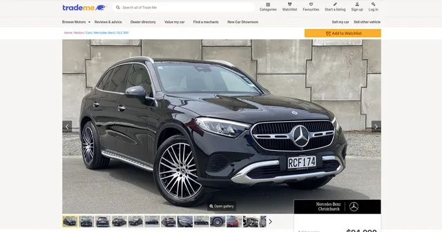 [{"listing_id": 5691057245,"title": "2025 Mercedes-Benz GLC 300 4MATIC SUV","category": "0001-0268-0311-","start_price": 94990,"start_date": "2025-12-22T02:50:14.013Z","end_date": "2026-04-05T03:50:14.013Z","listing_length": null,"has_gallery": true,"bidder_and_watchers": 14,"as_at": "2026-01-12T10:57:30.297Z","category_path": "/Trade-Me-Motors/Cars/MercedesBenz","photo_id": 2273604064,"region_id": 16,"region": "Canterbury","suburb_id": 86,"suburb": "Christchurch","view_count": 512,"note_date": "1970-01-01T00:00:00.000Z","category_name": "Mercedes-Benz","reserve_state": 3,"attributes": [{"name": "on_road_costs","display_name": "On road costs","value": "Included","encoded_value": "Included"},{"name": "number_plate","display_name": "Number plate","value": "RCF174","encoded_value": "RCF174"},{"name": "year","display_name": "Year","value": "2025","encoded_value": "2025"},{"name": "kilometres","display_name": "Kilometres","value": "10,600km","encoded_value": "10,600km"},{"name": "exterior_colour","display_name": "Exterior colour","value": "Black","encoded_value": "Black"},{"name": "body_style","display_name": "Body style","value": "RV/SUV","encoded_value": "RVSUV"},{"name": "seats","display_name": "Seats","value": "5","encoded_value": "5"},{"name": "fuel_type","display_name": "Fuel type","value": "Hybrid","encoded_value": "Hybrid"},{"name": "engine_size","display_name": "Engine size","value": "1991cc","encoded_value": "1991cc"},{"name": "transmission","display_name": "Transmission","value": "Automatic","encoded_value": "Automatic"},{"name": "4wd","display_name": "4WD","value": "4WD","encoded_value": "4WD"},{"name": "import_history","display_name": "Import history","value": "NZ New","encoded_value": "NZNew"},{"name": "model_detail","display_name": "Model detail","value": "4MATIC SUV","encoded_value": "4MATICSUV"},{"name": "fuel_economy_stars","display_name": "Fuel economy stars","value": "2 out of 6","encoded_value": "2outof6"}],"hidden_attributes": [{"name": "autobase_customer_id","display_name": "Autobase Customer Id","value": "1719"},{"name": "autobase_id","display_name": "autobase_id","value": "5907535"}],"is_classified": true,"open_homes": [],"subtitle": "Balance of 5 year warranty and 3 year service plan","geographic_location": {"latitude": -43.533116,"longitude": 172.633745,"accuracy": 2},"price_display": "Asking price: $94,990","additional_data": {"bullet_points": [],"tags": []},"canonical_path": "/motors/cars/mercedes-benz/glc-300/listing/5691057245","breadcrumbs": [{"display_name": "Motors","canonical_path": "/motors","canonical_path_fragment": "motors","name": "category","value": "1"},{"display_name": "Cars","canonical_path": "/motors/cars","canonical_path_fragment": "cars","name": "category","value": "268"},{"display_name": "Mercedes-Benz","canonical_path": "/motors/cars/mercedes-benz","canonical_path_fragment": "mercedes-benz","name": "make","value": "Mercedes-Benz"},{"display_name": "GLC 300","canonical_path": "/motors/cars/mercedes-benz/glc-300","canonical_path_fragment": "glc-300","name": "model","value": "GLC 300"},{"display_name": "5691057245","canonical_path": "/motors/cars/mercedes-benz/glc-300/listing/5691057245","canonical_path_fragment": "5691057245","name": "listing_id","value": "5691057245"}],"listing_platform": 1,"allows_pickups": 1,"member": null,"body": "Transmission Details: 9 Speed Automatic \n\nThe 2025 Mercedes-Benz GLC 300 is a well-rounded luxury SUV with excellent performance, technology, and comfort. It's ideal for those who want a stylish and functional vehicle with a smooth, engaging driving experience and all the advanced features you expect from a premium brand.\n\nTECHNICAL INFORMATION\n1, 991cc 4-Cylinder Petrol Turbocharged Engine\n190kW of Power\n370Nm of Torque\n4MATIC All-Wheel Drive\n9 Speed Automatic Transmission\n8.2L/100km Combined Fuel Consumption\n\nINTERIOR HIGHLIGHTS\nBlack Artico interior\nCentre display\nFront wireless phone charging\nElectrically adjustable/memory front seats\nHeated front seats\nSteering wheel in leather\nSmartphone integration (Apple CarPlay & Google Android Auto)\nMercedes me connect\nAdaptive cruise control Pro (DISTRONIC Pro)\n360 camera and 180 degree front view for off-road driving\n\nEXTERIOR HIGHLIGHTS\nPanoramic glass sunroof\n20 inch AMG 5 twin-spoke alloy wheels in bi-colour black\nAMG bodystyling\n\nDiscover the Armstrongs difference.\nOffering over 1,000 quality new and used vehicles, Armstrongs makes it easy to find the right car to suit your lifestyle and price range.\nWith an extensive network of dealerships across NZin Auckland, Wellington, Christchurch, and Dunedin. Proudly representing over 20 of the worlds most trusted automotive brands, Armstrongs is committed to delivering exceptional customer service, expert advice, and vehicles you can rely on.\nArmstrongs - Passionate about cars, driven by people.","photos": [{"key": 2273604064,"value": {"thumbnail": "https://trademe.tmcdn.co.nz/photoserver/thumb/2273604064.jpg","list": "https://trademe.tmcdn.co.nz/photoserver/lv2/2273604064.jpg","medium": "https://trademe.tmcdn.co.nz/photoserver/med/2273604064.jpg","gallery": "https://trademe.tmcdn.co.nz/photoserver/gv/2273604064.jpg","large": "https://trademe.tmcdn.co.nz/photoserver/tq/2273604064.jpg","full_size": "https://trademe.tmcdn.co.nz/photoserver/full/2273604064.jpg","plus_size": "https://trademe.tmcdn.co.nz/photoserver/plus/2273604064.jpg","photo_id": 2273604064}},{"key": 2273604072,"value": {"thumbnail": "https://trademe.tmcdn.co.nz/photoserver/thumb/2273604072.jpg","list": "https://trademe.tmcdn.co.nz/photoserver/lv2/2273604072.jpg","medium": "https://trademe.tmcdn.co.nz/photoserver/med/2273604072.jpg","gallery": "https://trademe.tmcdn.co.nz/photoserver/gv/2273604072.jpg","large": "https://trademe.tmcdn.co.nz/photoserver/tq/2273604072.jpg","full_size": "https://trademe.tmcdn.co.nz/photoserver/full/2273604072.jpg","plus_size": "https://trademe.tmcdn.co.nz/photoserver/plus/2273604072.jpg","photo_id": 