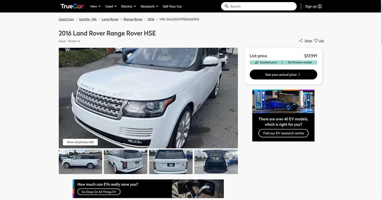 [{"id": "TGlzdGluZy1TQUxHUzJWRjVHQTI0NzYxMg==","tcplus_eligible": false,"consumer_deal": null,"vehicle": {"__typename": "Vehicle","condition": "USED","year": 2016,"make": {"__ref": "Make:TWFrZS0yMw=="},"model": {"__ref": "Model:TW9kZWwtMjM2NA=="},"vin": "SALGS2VF5GA247612","fuel_type": "Gas","seller_notes": "2016 LAND ROVER RANGE ROVER HSE Clean Title Clean CARFAX, Well Maintained, Navigation, Bluetooth, Backup Camera + Sensors, Meridian Audio, Dual Climate Control, Blind Spot Monitoring, Power Liftgate, Air Lift Suspension, Cruise Control, Panoramic Sunroof and Tons More! All Trades Welcome, Creative Financing Available! CALL US 24/7 425-967-3227","style": {"__ref": "Style:U3R5bGUtNTI1NTI="},"cpo_program": null,"body_style": "SUV","stock_number": null,"condition_history": {"__typename": "VehicleConditionHistory","report_pull_date": "2025-12-20T09:55:01+00:00","accident_count": 0,"auto_check_url": "https://www.autocheck.com/vehiclehistory/?siteID=8900&vin=SALGS2VF5GA247612","is_rental_car": false,"is_fleet_car": false,"is_frame_damaged": false,"owner_count": 2,"is_report_free": false,"title_info": {"__typename": "VehicleTitleInfo","is_clean_title": true,"is_lemon": false,"is_salvage": false,"is_theft_recovered": false}},"engine": "3.0L V-6 Gas Supercharged","exterior_color": {"__ref": "VehicleColor:VmVoaWNsZUNvbG9yLTc4NDE0NQ=="},"interior_color": {"__typename": "GenericColor","name": "Beige","rgb_hex": null},"mileage": 79634,"mpg": {"__typename": "VehicleMPG","highway": 23,"city": 17,"combined": 19},"transmission": "Automatic","certified_pre_owned": null,"facets": {"__typename": "ListingVehicleFacets","specs": {"__typename": "ListingVehicleFacetGroupConnection","edges": [{"__typename": "ListingVehicleFacetGroupEdge","cursor": "MQ","node": {"__typename": "ListingVehicleFacetGroup","name": "Mechanical","facets": [{"__typename": "ListingVehicleFacet","name": "Front Brake Diameter","units": "in","value_type": "FLOAT","value": "15"},{"__typename": "ListingVehicleFacet","name": "Rear Brake Diameter","units": "in","value_type": "FLOAT","value": "13.8"},{"__typename": "ListingVehicleFacet","name": "First Gear Ratio","units": null,"value_type": "FLOAT","value": "4.7"},{"__typename": "ListingVehicleFacet","name": "Second Gear Ratio","units": null,"value_type": "FLOAT","value": "3.13"},{"__typename": "ListingVehicleFacet","name": "Third Gear Ratio","units": null,"value_type": "FLOAT","value": "2.1"},{"__typename": "ListingVehicleFacet","name": "Fourth Gear Ratio","units": null,"value_type": "FLOAT","value": "1.67"},{"__typename": "ListingVehicleFacet","name": "Fifth Gear Ratio","units": null,"value_type": "FLOAT","value": "1.29"},{"__typename": "ListingVehicleFacet","name": "Sixth Gear Ratio","units": null,"value_type": "FLOAT","value": "1.0"},{"__typename": "ListingVehicleFacet","name": "Seventh Gear Ratio","units": null,"value_type": "FLOAT","value": "0.84"},{"__typename": "ListingVehicleFacet","name": "Eighth Gear Ratio","units": null,"value_type": "FLOAT","value": "0.67"},{"__typename": "ListingVehicleFacet","name": "Reverse Gear Ratio","units": null,"value_type": "FLOAT","value": "3.32"}]}},{"__typename": "ListingVehicleFacetGroupEdge","cursor": "Mg","node": {"__typename": "ListingVehicleFacetGroup","name": "Interior","facets": [{"__typename": "ListingVehicleFacet","name": "Front Head Room","units": "in","value_type": "FLOAT","value": "39.3"},{"__typename": "ListingVehicleFacet","name": "Front Leg Room","units": "in","value_type": "FLOAT","value": "42.5"},{"__typename": "ListingVehicleFacet","name": "Front Shoulder Room","units": "in","value_type": "FLOAT","value": "60.7"},{"__typename": "ListingVehicleFacet","name": "Rear Head Room","units": "in","value_type": "FLOAT","value": "39.2"},{"__typename": "ListingVehicleFacet","name": "Rear Leg Room","units": "in","value_type": "FLOAT","value": "40.2"},{"__typename": "ListingVehicleFacet","name": "Rear Shoulder Room","units": "in","value_type": "FLOAT","value": "59.4"}]}},{"__typename": "ListingVehicleFacetGroupEdge","cursor": "Mw","node": {"__typename": "ListingVehicleFacetGroup","name": "Exterior","facets": [{"__typename": "ListingVehicleFacet","name": "Width","units": "in","value_type": "FLOAT","value": "78.1"},{"__typename": "ListingVehicleFacet","name": "Height","units": "in","value_type": "FLOAT","value": "72.3"},{"__typename": "ListingVehicleFacet","name": "Wheelbase","units": "in","value_type": "FLOAT","value": "115"},{"__typename": "ListingVehicleFacet","name": "Ground Clearance Min","units": "in","value_type": "FLOAT","value": "8.7"},{"__typename": "ListingVehicleFacet","name": "Turning Diameter","units": "ft","value_type": "FLOAT","value": "40.4"},{"__typename": "ListingVehicleFacet","name": "Bed Width @ Wheel Wells","units": "in","value_type": "FLOAT","value": "44.1"},{"__typename": "ListingVehicleFacet","name": "Bed Height","units": "in","value_type": "FLOAT","value": "32.4"}]}},{"__typename": "ListingVehicleFacetGroupEdge","cursor": "NA","node": {"__typename": "ListingVehicleFacetGroup","name": "Weights","facets": [{"__typename": "ListingVehicleFacet","name": "Curb Weight","units": "lbs","value_type": "FLOAT","value": "5462.0"},{"__typename": "ListingVehicleFacet","name": "Gross Vehicle Weight Rating (GVWR)","units": "lbs","value_type": "INTEGER","value": "6945"},{"__typename": "ListingVehicleFacet","name": "Gross Combined Weight Rating (GCWR)","units": "lbs","value_type": "INTEGER","value": "14661"}]}},{"__typename": "ListingVehicleFacetGroupEdge","cursor": "NQ","node": {"__typename": "ListingVehicleFacetGroup","name": "Capacities","facets": [{"__typename": "ListingVehicleFacet","name": "Fuel Tank Capacity","units": "gal","value_type": "FLOAT","value": "22.5"},{"__typename": "ListingVehicleFacet","name": "1st Row Seat Capacity","units": "passenger","value_type": "INTEGER","value": "2"},{"__typename": "ListingVehicleFacet","name": "2nd Row Seat Capacity","units": "passenger","value_type": "INTEGER","value": "3"},{"__typename": "Listin