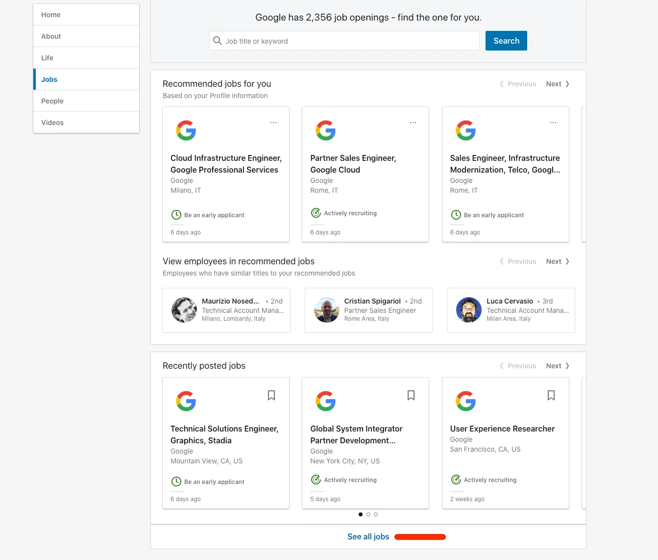 - Go to the LinkedIn page of the company you are interested in (e.g. https://www.linkedin.com/company/google).