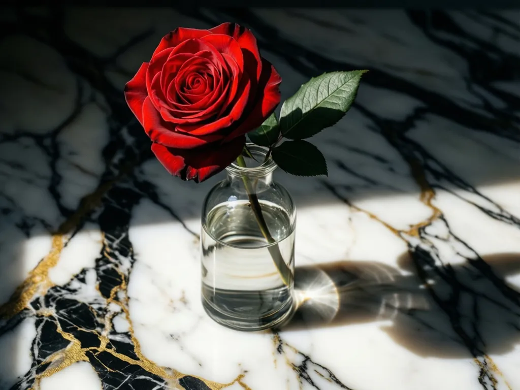 | Single red rose in a clear glass vase on white marble streaked with black and gold veins, harsh directional shadow, high contrast, editorial style, clean negative space. | ![]() |
