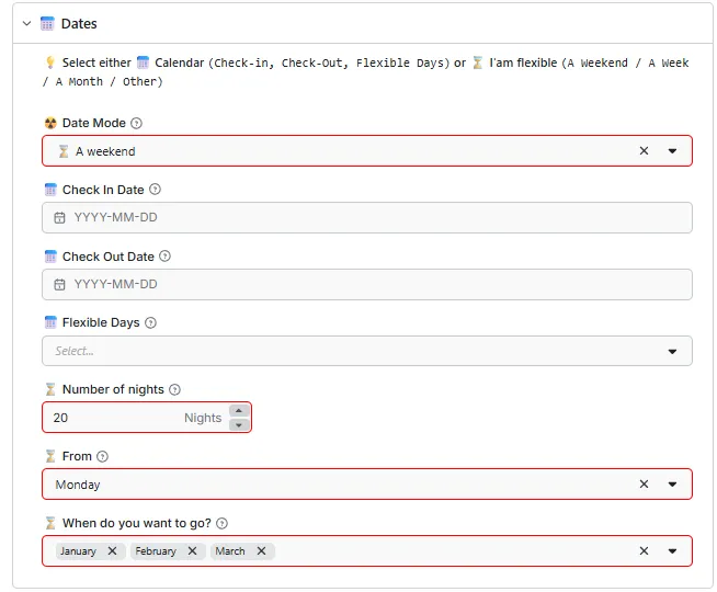 {..."date_mode": "other","flex_months": ["1", "2", "3"], # January, February, March, etc."flex_nights": 20, # 20 nights"flex_from": 1 # Monday...}