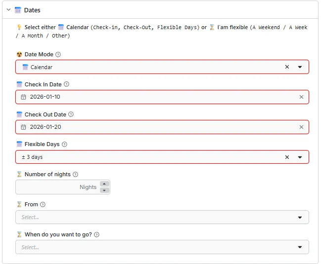 {..."date_mode": "calendar", # optional (can be empty)"check_in": "2025-01-10","check_out": "2025-01-20","flex_days": 3,...}