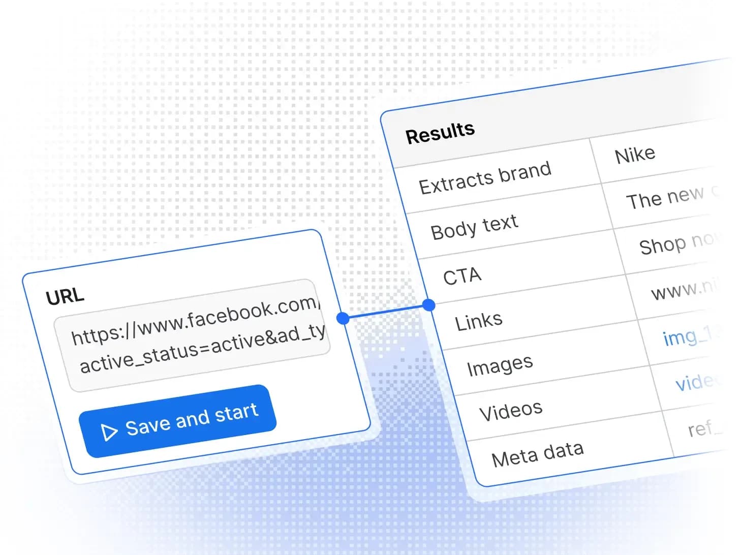 Scraping Meta ad data for your research or marketing projects is quick and simple. No fiddling with APIs - you can start scraping with just a short setup, using the URLs of either Facebook pages or a Meta Ad Library page. Export in any format you need: CSV, JSON, Excel, or via API.
