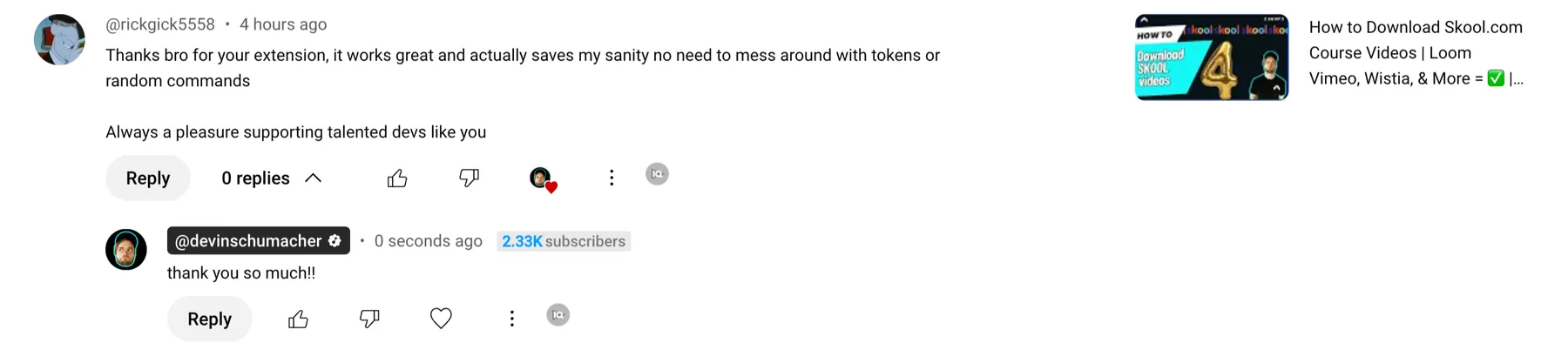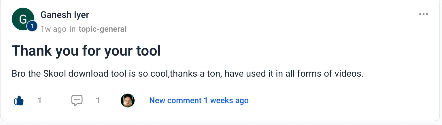 Skool video download has always been difficult because the platform hosts content across multiple video providers, but this extension detects them all automatically and saves everything as a standard MP4 file.