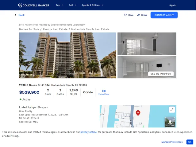 [{"canonical_listing_url": null,"price": {"list_price": 539900,"original_list_price": 539900,"currency": "USD"},"summary": {"address_line1": "2030 S Ocean Dr #1504","address_line3": "Hallandale Beach, FL 33009","list_price": "$539,900","closed_list_price": "$539,900","bedrooms_total": 2,"bathrooms_total": 2,"listing_sq_ft": 1248,"square_feet": "1,248","property_type": "Condo","standard_status": "ACTIVE","geogson_location": {"lat": 25.978299,"lng": -80.119323},"listing_attribution": {"listed_by": [{"agent_name": "Igor Shrayev"}],"agent_offices": [{"office_name": "Gma Realty"}],"last_updated_timestamp": "December 7, 2025, 10:54 AM","mls_listing_id": "A11926412","source_name": "SEFMLS","display_order": {"list_by_desc": false,"offices_desc": false},"is_brand_listing": false},"is_address_hidden": false,"is_price_hidden": false,"is_sold_listing": false,"is_virtual_tour_available": true,"virtual_tour_url_unbranded": "https://www.propertypanorama.com/instaview/mia/A11926412"},"about": {"address_line1": "2030 S Ocean Dr #1504","is_property_type_land": false,"description": "Beautifully renovated 2 bed 2 bath residence with full, recent interior updates. The unit features a contemporary kitchen with new cabinetry and new stainless appliances, fully remodeled bathrooms, and large-format 24x48 porcelain tile throughout. Located directly on the beach with unlimited beach access. The private balcony offers wide intracoastal, city, and sunset views. Amenities include a heated pool, hot spa, steam rooms, saunas, fitness center, billiards, BBQ area, and on-site café. The association provides complimentary pool and beach service with lounge chairs and umbrellas. Minutes to shopping, restaurants, Gulfstream Park, Aventura Mall, Hollywood Broadwalk, Hard Rock, and major airports. Move-in ready South Florida coastal living.","home_facts": {"property_type": "Condo","bathrooms_total": 2,"bedrooms_total": 2,"year_built": 1971},"price_summary": {"list_price": "539,900","price_per_sq_ft": "$432 per Sq. Ft."},"mls_listing_id": "A11926412","last_updated_timestamp": "December 7, 2025, 10:54 AM"},"room_and_interior": {"bedrooms": {"bedrooms_total": 2},"bathrooms": {"bathrooms_total": 2,"bathrooms_full": 2},"interior": {"living_area": "1,248"}},"address": {"postal_code": "33009","state_or_province": "FL","state_or_province_name": "Florida","county_or_parish": "Broward","city": "Hallandale Beach","unparsed_address": "2030 S Ocean Dr #1504","street_name": "Ocean Dr","street_number": "2030","street_dir_prefix": "S","country": "US","country_code": "US","country_name": "United States"},"structure": {"structure_details": {"architecture_style": "High Rise","building_area": "1,248","year_built": 1971}},"finances": {"finances": {"list_price": "$539,900","price_per_sq_ft": "$432 per Sq. Ft."}},"location_and_schools": {"neighborhood": "Hallandale Beach","county": "Broward"},"media": {"images": [{"index_num": 0,"media_url": "https://images-listings.coldwellbanker.com/SEFMLS/A1/19/26/41/2/_P/A11926412_P00.jpg","is_portrait": false},{"index_num": 1,"media_url": "https://images-listings.coldwellbanker.com/SEFMLS/A1/19/26/41/2/_P/A11926412_P01.jpg","is_portrait": false},{"index_num": 2,"media_url": "https://images-listings.coldwellbanker.com/SEFMLS/A1/19/26/41/2/_P/A11926412_P02.jpg","is_portrait": false},{"index_num": 3,"media_url": "https://images-listings.coldwellbanker.com/SEFMLS/A1/19/26/41/2/_P/A11926412_P03.jpg","is_portrait": false},{"index_num": 4,"media_url": "https://images-listings.coldwellbanker.com/SEFMLS/A1/19/26/41/2/_P/A11926412_P04.jpg","is_portrait": false},{"index_num": 5,"media_url": "https://images-listings.coldwellbanker.com/SEFMLS/A1/19/26/41/2/_P/A11926412_P05.jpg","is_portrait": false},{"index_num": 6,"media_url": "https://images-listings.coldwellbanker.com/SEFMLS/A1/19/26/41/2/_P/A11926412_P06.jpg","is_portrait": false},{"index_num": 7,"media_url": "https://images-listings.coldwellbanker.com/SEFMLS/A1/19/26/41/2/_P/A11926412_P07.jpg","is_portrait": false},{"index_num": 8,"media_url": "https://images-listings.coldwellbanker.com/SEFMLS/A1/19/26/41/2/_P/A11926412_P08.jpg","is_portrait": false},{"index_num": 9,"media_url": "https://images-listings.coldwellbanker.com/SEFMLS/A1/19/26/41/2/_P/A11926412_P09.jpg","is_portrait": false},{"index_num": 10,"media_url": "https://images-listings.coldwellbanker.com/SEFMLS/A1/19/26/41/2/_P/A11926412_P10.jpg","is_portrait": false},{"index_num": 11,"media_url": "https://images-listings.coldwellbanker.com/SEFMLS/A1/19/26/41/2/_P/A11926412_P11.jpg","is_portrait": false},{"index_num": 12,"media_url": "https://images-listings.coldwellbanker.com/SEFMLS/A1/19/26/41/2/_P/A11926412_P12.jpg","is_portrait": false},{"index_num": 13,"media_url": "https://images-listings.coldwellbanker.com/SEFMLS/A1/19/26/41/2/_P/A11926412_P13.jpg","is_portrait": false},{"index_num": 14,"media_url": "https://images-listings.coldwellbanker.com/SEFMLS/A1/19/26/41/2/_P/A11926412_P14.jpg","is_portrait": false},{"index_num": 15,"media_url": "https://images-listings.coldwellbanker.com/SEFMLS/A1/19/26/41/2/_P/A11926412_P15.jpg","is_portrait": false},{"index_num": 16,"media_url": "https://images-listings.coldwellbanker.com/SEFMLS/A1/19/26/41/2/_P/A11926412_P16.jpg","is_portrait": false},{"index_num": 17,"media_url": "https://images-listings.coldwellbanker.com/SEFMLS/A1/19/26/41/2/_P/A11926412_P17.jpg","is_portrait": false},{"index_num": 18,"media_url": "https://images-listings.coldwellbanker.com/SEFMLS/A1/19/26/41/2/_P/A11926412_P18.jpg","is_portrait": false},{"index_num": 19,"media_url": "https://images-listings.coldwellbanker.com/SEFMLS/A1/19/26/41/2/_P/A11926412_P19.jpg","is_portrait": false},{"index_num": 20,"media_url": "https://images-listings.coldwellbanker.com/SEFMLS/A1/19/26/41/2/_P/A11926412_P20.jpg","is_portrait": false},{"index_num": 21,"media_url": "https://images-listings.coldwellbanker.com/SEFMLS/A1/19/26/41/2/_P/A11926412_P21.jpg","is_portrait": false}]},"idx_feed_attribution": {"idx_feed_attributi