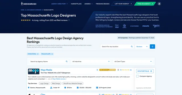 The scraper processes DesignRush search result and category listing pages where multiple agencies appear. These are the pages you see after filtering by category (logo design, web development), location (Massachusetts, New York), or sorting criteria (highest rated, most reviewed).