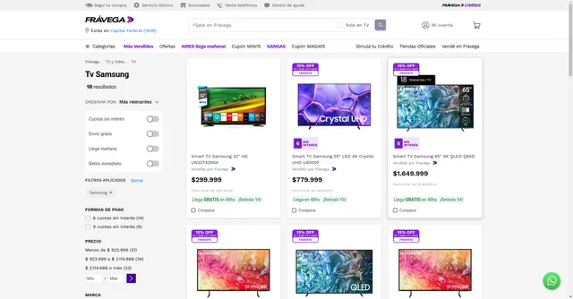 The platform features comprehensive product information including multiple seller options, detailed pricing with Argentine peso installment plans (cuotas), stock availability, and rich product imagery. For businesses operating in or expanding to Latin American markets, Fravega data reveals pricing strategies, product availability patterns, and consumer demand signals.