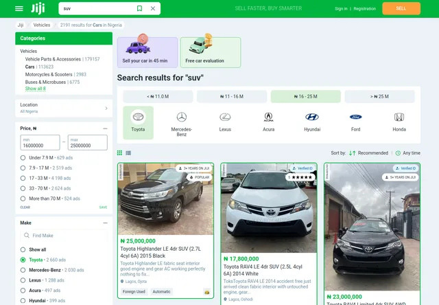 This URL searches for Toyota SUVs priced between ₦16M-₦25M. Filter parameters vary by category—cars have make/model filters, electronics have brand/condition, real estate has property types and bedroom counts.