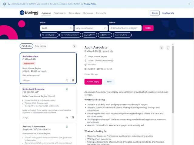 [{"advertiser": {"id": "60532125","description": "S C Mohan PAC"},"bullet_points": ["Near MRT station","Good working environment","Training provided"],"branding": {"serp_logo_url": "https://bx-branding-gateway.cloud.seek.com.au/7d8b7004-fb31-47e1-ac09-d54fc4fac92d.1/serpLogo"},"classifications": [{"classification": {"id": "1200","description": "Accounting"},"subclassification": {"id": "6144","description": "Audit - External"}}],"company_name": "S C Mohan Pac","company_profile_structured_data_id": 623201,"display_style": {"search": "sourcrProfile"},"display_type": "standard","employer": {"id": "623201","name": "S C Mohan Pac","company_id": "168550432318504","company_url": "https://sg.jobstreet.com/companies/s-c-mohan-pac-168550432318504"},"id": "88970463","is_featured": false,"listing_date": "2025-12-05T01:10:07Z","listing_date_display": "7d ago","locations": [{"label": "Tai Seng, North-East Region","country_code": "SG","seo_hierarchy": [{"contextual_name": "Tai Seng North-East Region"},{"contextual_name": "North-East Region"}]}],"role_id": "audit-assistant","salary_label": "$3,000 – $4,000 per month","sol_metadata": {"search_request_token": "84a514bf-a915-47f6-aa41-b8a4632fac08","token": "0~84a514bf-a915-47f6-aa41-b8a4632fac08","job_id": "88970463","section": "MAIN","section_rank": 1,"job_ad_type": "ORGANIC","tags": {"mordor__flights": "mordor_713","mordor__s": "0"}},"teaser": "Good job development and prospects.","title": "Audit Assistant","tracking": "ewogICJ0b2tlbiI6ICJlZDVmNDNiZi02NmQ1LTQ1ZTktOTQwMy1jZmVhODA4NjQxYmFfMSIKfQ==","work_types": ["Full time"],"work_arrangements": {"data": [{"id": "1","label": {"text": "On-site"}}]},"from_url": "https://sg.jobstreet.com/audit-jobs"}]
