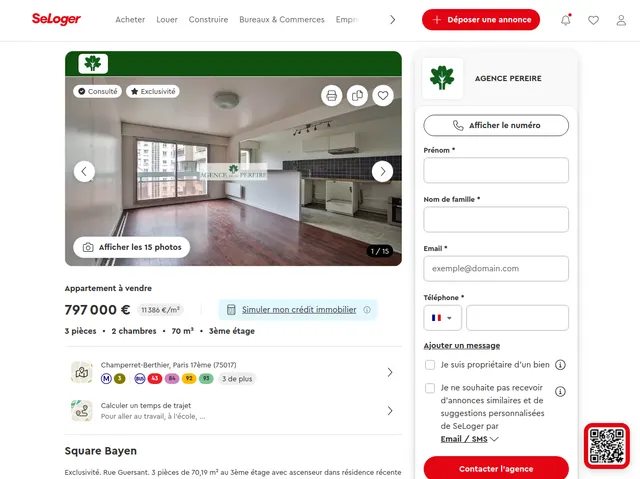 [{"brand": "seloger","id": "258AA8631CJV","title": null,"metadata": {"legacy_id": "256305261","creation_date": "2025-12-11T16:07:00Z","update_date": "2025-12-11T16:11:06.386Z","status": {"status": true,"enrichments": {"contact_settings": false,"geo": false,"intermediary": false,"media": false,"online_id": false}},"is_new_build_project": false},"location": {"address": {"country": "FRA","city": "Paris 17ème","zip_code": "75017","district": "Champerret-Berthier"},"is_address_published": true,"geometry": {"type": "Point","coordinates": [2.29114,48.88388]},"transport": {"closest_lines": [{"type": "METRO","lines": [{"name": "3","color": "#827a04"}]},{"type": "BUS","lines": [{"name": "43","color": "#ed1b2a"},{"name": "84","color": "#d282be"},{"name": "92","color": "#ffbe02"},{"name": "93","color": "#77c695"},{"name": "163","color": "#dc9609"},{"name": "164","color": "#a0006e"},{"name": "341","color": "#ffbe02"}]}]}},"description": {"description": "Exclusivité. Rue Guersant. 3 pièces de 70,19 m² au 3ème étage avec ascenseur dans résidence récente de bon standing. Entrée, salon avec cuisine ouverte de 30 m², deux chambres, salle de bains, wc séparés. Cave et parking en sous-sol. Côté cour. A rafraîchir. Accès par la rue Guersant et par le square Bayen.","texts": [{"text": "Exclusivité. Rue Guersant. 3 pièces de 70,19 m² au 3ème étage avec ascenseur dans résidence récente de bon standing. Entrée, salon avec cuisine ouverte de 30 m², deux chambres, salle de bains, wc séparés. Cave et parking en sous-sol. Côté cour. A rafraîchir. Accès par la rue Guersant et par le square Bayen."}],"headline": "Square Bayen"},"hard_facts": null,"energy": {"features": [{"type": "yearOfConstruction","label": "Année de construction","value": "1977"},{"type": "state","label": "État","value": "Rénovation nécessaire"},{"type": "heatingSystem","label": "Type de chauffage","value": "Chauffage au sol"}],"certificates": [{"key": "22abeae9-9e17-4a78-96de-74831ca4f0ab","features": [{"type": "nameOfCertificate","label": "Diagnostic réalisé","value": "Après le 1er juillet 2021"}],"scales": [{"key": "c55d23ea-dbaf-4318-93a2-fa87184b9147","efficiency_class": {"index": 3,"rating": "D"},"values": [{"value": "217 kWh/m².an","label": "Consommation (énergie primaire)"},{"value": "7 kg CO₂/m².an","label": "Émissions"}],"name": "Diagnostic de performance énergétique (DPE)","segments": [{"label": "A","value": ""},{"label": "B","value": ""},{"label": "C","value": ""},{"label": "D","value": ""},{"label": "E","value": ""},{"label": "F","value": "Passoire énergétique"},{"label": "G","value": "Passoire énergétique"}],"type": "FR_ENERGY_AFTER_2021","aria_label": "EfficiencyClass : D avec une plage allant de A à G .La consommation d'énergie est undefined kWhEP/m².an kilowattheures par mètre carré.","display_unhappy_house_icon": false},{"key": "b77c81dd-28b0-46f4-af82-387c60c1bc22","efficiency_class": {"index": 1,"rating": "B"},"values": [{"value": "7 kg CO₂/m².an","label": "Émissions"}],"name": "Indice d'émission de gaz à effet de serre (GES)","segments": [{"label": "A","value": ""},{"label": "B","value": ""},{"label": "C","value": ""},{"label": "D","value": ""},{"label": "E","value": ""},{"label": "F","value": ""},{"label": "G","value": ""}],"type": "FR_GHG_AFTER_2021","aria_label": "EfficiencyClass : B avec une plage allant de A à G .La consommation d'énergie est undefined kWhEP/m².an kilowattheures par mètre carré.","display_unhappy_house_icon": false}]}],"has_scales": true},"key": {"keys": [{"label": "Identifiant","value": "256305261"},{"label": "Référence annonce","value": "86458781"}]},"price": {"base": {"main": {"key": "82b661de-c1ac-4e56-8961-213ddc78627f","label": {"main": "Prix du bien"},"value": {"main": {"value": "797 000 €","aria_label": "797000 €"},"alt": {"value": "11 385,71 €/m²","aria_label": "11385,71 euros par mètre carré"}}},"type": "SALE"},"components": [{"key": "441b180c-1905-495c-8d19-8417a73afb2b","type": "PRIMARY","units": [{"key": "65ab7615-596a-4306-8d94-7ecee49a21d5","main": {"price": {"key": "34b1fe42-4ae5-49b0-82d7-6705c22629a0","label": {"main": "Prix du bien","alt": "honoraires inclus"},"value": {"main": {"value": "797 000 €","aria_label": "797000 €"},"alt": {"value": "11 385,71 €/m²","aria_label": "11385,71 euros par mètre carré"}},"highlighted": true},"message": {"type": "INFO","value": "Les honoraires sont à la charge de l'acquéreur"}},"details": [{"key": "d576d353-2f4f-46f4-b7b5-0cd10f98665a","label": "Inclus","prices": [{"key": "61fdcf0d-abde-4f25-b58b-03525ccaadf6","label": {"main": "Prix hors honoraires"},"value": {"main": {"value": "770 000 €","aria_label": "770000 €"}}},{"key": "680224db-2fd5-4205-8c4f-f3aa19c5745f","label": {"main": "Honoraires TTC à la charge de l'acquéreur (3,51% du prix du bien hors honoraires)"},"value": {"main": {"value": "27 000 €","aria_label": "27000 €"}}}]}]},{"key": "dba7e584-69e5-406e-838f-8b7effc489bc","main": {"price": {"key": "d124ff6c-8c5e-4d6b-b72c-490fb7f58519","label": {"main": "Frais de notaires estimés"},"value": {"main": {"value": "63 760 €","aria_label": "63760 €"}},"info": {"value": "Les frais de notaire représentent environ 8% du prix du bien dans l'ancien et 3% dans le neuf. Le montant estimé est donné à titre indicatif."}}}},{"key": "8419f9dd-63c5-4924-97b7-bb3dec3e9369","main": {"price": {"key": "3ca5dd43-3730-42bf-bc9d-909e9b5b41b4","label": {"main": "Montant estimé du projet"},"value": {"main": {"value": "860 760 €","aria_label": "860760 €"}},"highlighted": true}}}]}],"layout": "FRENCH_SALE","breakdown": {"groups": [{"key": "c8ee4490-fee2-4651-a361-90e70f8fa9cc","label": {"main": "Prix du bien","alt": "honoraires inclus"},"value": {"main": {"value": "797 000 €","aria_label": "797000 €"},"alt": {"value": "11 385,71 €/m²","aria_label": "11385,71 euros par mètre carré"}},"color_type": "MAIN_PRICE","highlighted": true,"items": [{"key": "6b26b197
