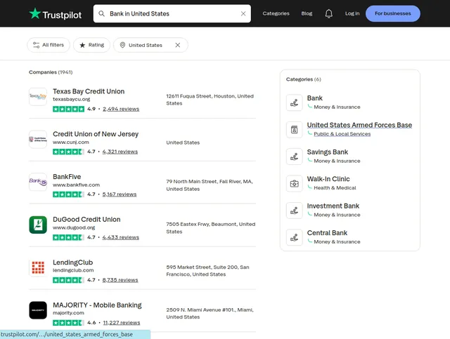 [{"business_unit_id": "603936ef6ab2220001c9aae4","stars": 5,"identifying_name": "texasbaycu.org","display_name": "Texas Bay Credit Union","logo_url": "//s3-eu-west-1.amazonaws.com/tpd/logos/603936ef6ab2220001c9aae4/0x0.png","number_of_reviews": 2494,"trust_score": 4.9,"location": {"address": "12611 Fuqua Street","city": "Houston","zip_code": "77034","country": "United States"},"is_recommended_in_categories": false,"contact": {"website": "https://texasbaycu.org","email": "marketing@tbacu.org","phone": "713.852.6700"},"categories": [{"category_id": "credit_union","display_name": "Credit Union","is_predicted": false},{"category_id": "financial_institution","display_name": "Financial Institution","is_predicted": false},{"category_id": "bank","display_name": "Bank","is_predicted": false},{"category_id": "insurance_agency","display_name": "Insurance Agency","is_predicted": false},{"category_id": "mortgage_lender","display_name": "Mortgage Lender","is_predicted": false}],"from_url": "https://www.trustpilot.com/search?query=Bank%20in%20United%20States&experiment=semantic_search_enabled"}]