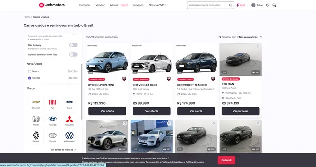 Webmotors.com.br is Brazil's premier online automotive marketplace, connecting millions of buyers with new and used vehicle sellers across the country. As one of Latin America's largest vehicle listing platforms, it provides real-time market data on pricing, inventory trends, and vehicle availability—essential intelligence for dealerships, market researchers, and automotive businesses.