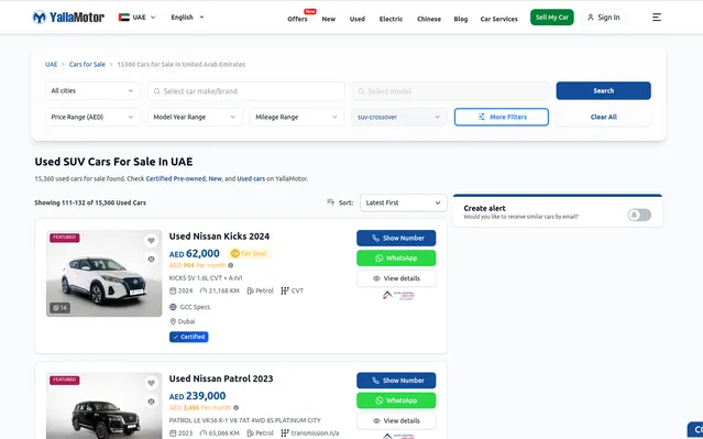 YallaMotor.com is the Middle East's leading automotive marketplace, connecting buyers and sellers across UAE, Saudi Arabia, Egypt, Kuwait, Bahrain, Oman, and Qatar. The platform specializes in used car listings with detailed specifications, multilingual support (English/Arabic), and region-specific pricing—making it essential for understanding automotive markets in the Gulf and North Africa.