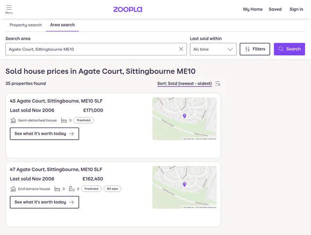 [{"uprn": "10013739573","last_sale": {"__typename": "LastSaleData","date": "2024-05-24T12:00:00.000Z","price": 160000},"address": {"uprn": "10013739573","full_address": "2 Agate Court, Sittingbourne, ME10 5LF","postcode": "ME10 5LF","latitude": 51.348838,"longitude": 0.7224508},"attributes": {"bathrooms": 1,"bedrooms": 2,"living_rooms": 1,"property_type": "Flat/Maisonette","tenure": "Leasehold","floor_area_sq_m": 59},"sale_estimate": {"lower_price": 160000,"upper_price": 176000},"history": {"historic_listings": [{"images": [{"thumbnail": "https://lid.zoocdn.com/150/113/9b5bee8bb4b70997aa3b328f45c10628ea4204f5.jpg","medium": "https://lid.zoocdn.com/645/430/9b5bee8bb4b70997aa3b328f45c10628ea4204f5.jpg","large": "https://lid.zoocdn.com/1024/768/9b5bee8bb4b70997aa3b328f45c10628ea4204f5.jpg"},{"thumbnail": "https://lid.zoocdn.com/150/113/bfbdb75e0908143b9920595deacd6bb2a8eab428.jpg","medium": "https://lid.zoocdn.com/645/430/bfbdb75e0908143b9920595deacd6bb2a8eab428.jpg","large": "https://lid.zoocdn.com/1024/768/bfbdb75e0908143b9920595deacd6bb2a8eab428.jpg"},{"thumbnail": "https://lid.zoocdn.com/150/113/e46203d7e291d843210c830d9f1b57e54ba1251a.jpg","medium": "https://lid.zoocdn.com/645/430/e46203d7e291d843210c830d9f1b57e54ba1251a.jpg","large": "https://lid.zoocdn.com/1024/768/e46203d7e291d843210c830d9f1b57e54ba1251a.jpg"},{"thumbnail": "https://lid.zoocdn.com/150/113/9ec549bb6a500715accdf38a37d5105b66de28f2.jpg","medium": "https://lid.zoocdn.com/645/430/9ec549bb6a500715accdf38a37d5105b66de28f2.jpg","large": "https://lid.zoocdn.com/1024/768/9ec549bb6a500715accdf38a37d5105b66de28f2.jpg"},{"thumbnail": "https://lid.zoocdn.com/150/113/03d9aa2f4e8431ebfb3131b32e729f5bab4e7dfa.jpg","medium": "https://lid.zoocdn.com/645/430/03d9aa2f4e8431ebfb3131b32e729f5bab4e7dfa.jpg","large": "https://lid.zoocdn.com/1024/768/03d9aa2f4e8431ebfb3131b32e729f5bab4e7dfa.jpg"},{"thumbnail": "https://lid.zoocdn.com/150/113/dd2441024a21c47be88ad85a92f98d6018a88023.jpg","medium": "https://lid.zoocdn.com/645/430/dd2441024a21c47be88ad85a92f98d6018a88023.jpg","large": "https://lid.zoocdn.com/1024/768/dd2441024a21c47be88ad85a92f98d6018a88023.jpg"},{"thumbnail": "https://lid.zoocdn.com/150/113/54c92156483e70e1850d8e58d69680ea9328b257.jpg","medium": "https://lid.zoocdn.com/645/430/54c92156483e70e1850d8e58d69680ea9328b257.jpg","large": "https://lid.zoocdn.com/1024/768/54c92156483e70e1850d8e58d69680ea9328b257.jpg"},{"thumbnail": "https://lid.zoocdn.com/150/113/2e40875caf0d1f4d9a61018844ffbdf3ba9e4c08.jpg","medium": "https://lid.zoocdn.com/645/430/2e40875caf0d1f4d9a61018844ffbdf3ba9e4c08.jpg","large": "https://lid.zoocdn.com/1024/768/2e40875caf0d1f4d9a61018844ffbdf3ba9e4c08.jpg"},{"thumbnail": "https://lid.zoocdn.com/150/113/1c6d3db24570083a80a3db05a720b1dde1a72ea6.jpg","medium": "https://lid.zoocdn.com/645/430/1c6d3db24570083a80a3db05a720b1dde1a72ea6.jpg","large": "https://lid.zoocdn.com/1024/768/1c6d3db24570083a80a3db05a720b1dde1a72ea6.jpg"},{"thumbnail": "https://lid.zoocdn.com/150/113/acf5c04980f9edff54b29bef53a159100cee4807.jpg","medium": "https://lid.zoocdn.com/645/430/acf5c04980f9edff54b29bef53a159100cee4807.jpg","large": "https://lid.zoocdn.com/1024/768/acf5c04980f9edff54b29bef53a159100cee4807.jpg"}]},{"images": [{"thumbnail": "https://lid.zoocdn.com/150/113/fb89908871f511416f8c26d41a5f710b74607b9d.jpg","medium": "https://lid.zoocdn.com/645/430/fb89908871f511416f8c26d41a5f710b74607b9d.jpg","large": "https://lid.zoocdn.com/1024/768/fb89908871f511416f8c26d41a5f710b74607b9d.jpg"},{"thumbnail": "https://lid.zoocdn.com/150/113/51fcd0fc367d2bc9f4b3d744d530e577d6d1b07b.jpg","medium": "https://lid.zoocdn.com/645/430/51fcd0fc367d2bc9f4b3d744d530e577d6d1b07b.jpg","large": "https://lid.zoocdn.com/1024/768/51fcd0fc367d2bc9f4b3d744d530e577d6d1b07b.jpg"},{"thumbnail": "https://lid.zoocdn.com/150/113/932a52f445659b9bb1e66375bf6bad3fa2e00080.jpg","medium": "https://lid.zoocdn.com/645/430/932a52f445659b9bb1e66375bf6bad3fa2e00080.jpg","large": "https://lid.zoocdn.com/1024/768/932a52f445659b9bb1e66375bf6bad3fa2e00080.jpg"},{"thumbnail": "https://lid.zoocdn.com/150/113/8e6a11ff927d67abefa042c0089a509d422fd641.jpg","medium": "https://lid.zoocdn.com/645/430/8e6a11ff927d67abefa042c0089a509d422fd641.jpg","large": "https://lid.zoocdn.com/1024/768/8e6a11ff927d67abefa042c0089a509d422fd641.jpg"},{"thumbnail": "https://lid.zoocdn.com/150/113/e37b2859230df451346a10175b54ee59db83f6ce.jpg","medium": "https://lid.zoocdn.com/645/430/e37b2859230df451346a10175b54ee59db83f6ce.jpg","large": "https://lid.zoocdn.com/1024/768/e37b2859230df451346a10175b54ee59db83f6ce.jpg"},{"thumbnail": "https://lid.zoocdn.com/150/113/5f0deb053034b6fa390567e3ea1dad6610296830.jpg","medium": "https://lid.zoocdn.com/645/430/5f0deb053034b6fa390567e3ea1dad6610296830.jpg","large": "https://lid.zoocdn.com/1024/768/5f0deb053034b6fa390567e3ea1dad6610296830.jpg"},{"thumbnail": "https://lid.zoocdn.com/150/113/a46a64a9b061b40f2954a821ca68b89a30994fd0.jpg","medium": "https://lid.zoocdn.com/645/430/a46a64a9b061b40f2954a821ca68b89a30994fd0.jpg","large": "https://lid.zoocdn.com/1024/768/a46a64a9b061b40f2954a821ca68b89a30994fd0.jpg"},{"thumbnail": "https://lid.zoocdn.com/150/113/ec618601924facbb8a03946b01870ba55ace7ba4.jpg","medium": "https://lid.zoocdn.com/645/430/ec618601924facbb8a03946b01870ba55ace7ba4.jpg","large": "https://lid.zoocdn.com/1024/768/ec618601924facbb8a03946b01870ba55ace7ba4.jpg"},{"thumbnail": "https://lid.zoocdn.com/150/113/59f8143c1f751e060ccdf5f7ae2975e408864d11.jpg","medium": "https://lid.zoocdn.com/645/430/59f8143c1f751e060ccdf5f7ae2975e408864d11.jpg","large": "https://lid.zoocdn.com/1024/768/59f8143c1f751e060ccdf5f7ae2975e408864d11.jpg"},{"thumbnail": "https://lid.zoocdn.com/150/113/a70872f45119c377b73aa08f67129b0b5d4db180.jpg","medium": "https://lid.zoocdn.com/645/430/a70872f45119c377b73aa08f67129b0b5d4db180.jpg","large": "https://lid.zoocdn.com/1024/768/a70872f45119c377b73aa08f67129b0b5d4db180.jpg"},{"thumbnail": "https://lid.zoocdn.com/150/113/f2aa9dae3270bd11776cde5e203db8