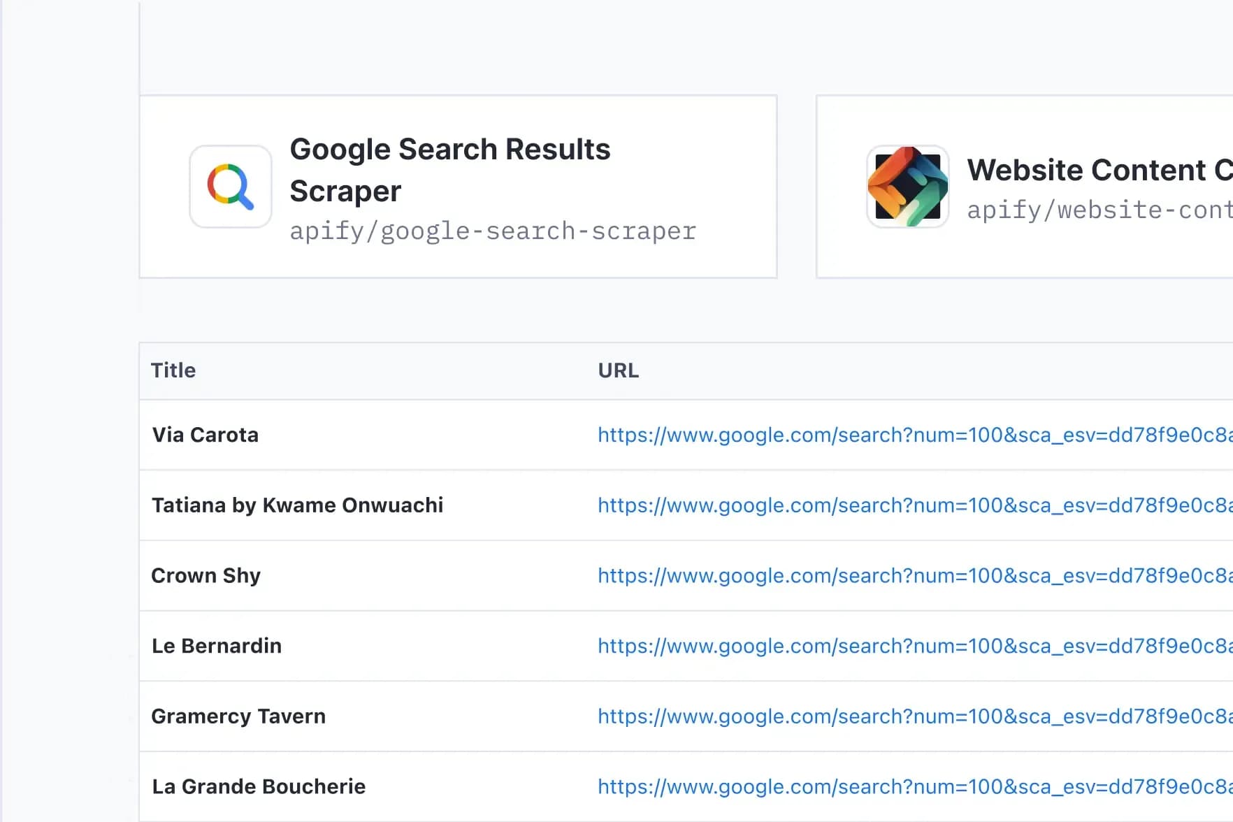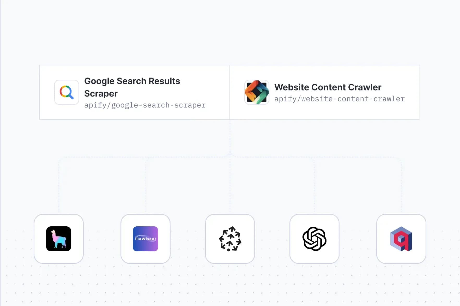 Google Search Results Scraper fetches URLs from Google based on precise search queries. Website Content Crawler extracts clean, structured content from URLs and converts HTML to Markdown. It removes headers, navigation bars, ads, and pop-ups and outputs data in formats ready for vector databases.