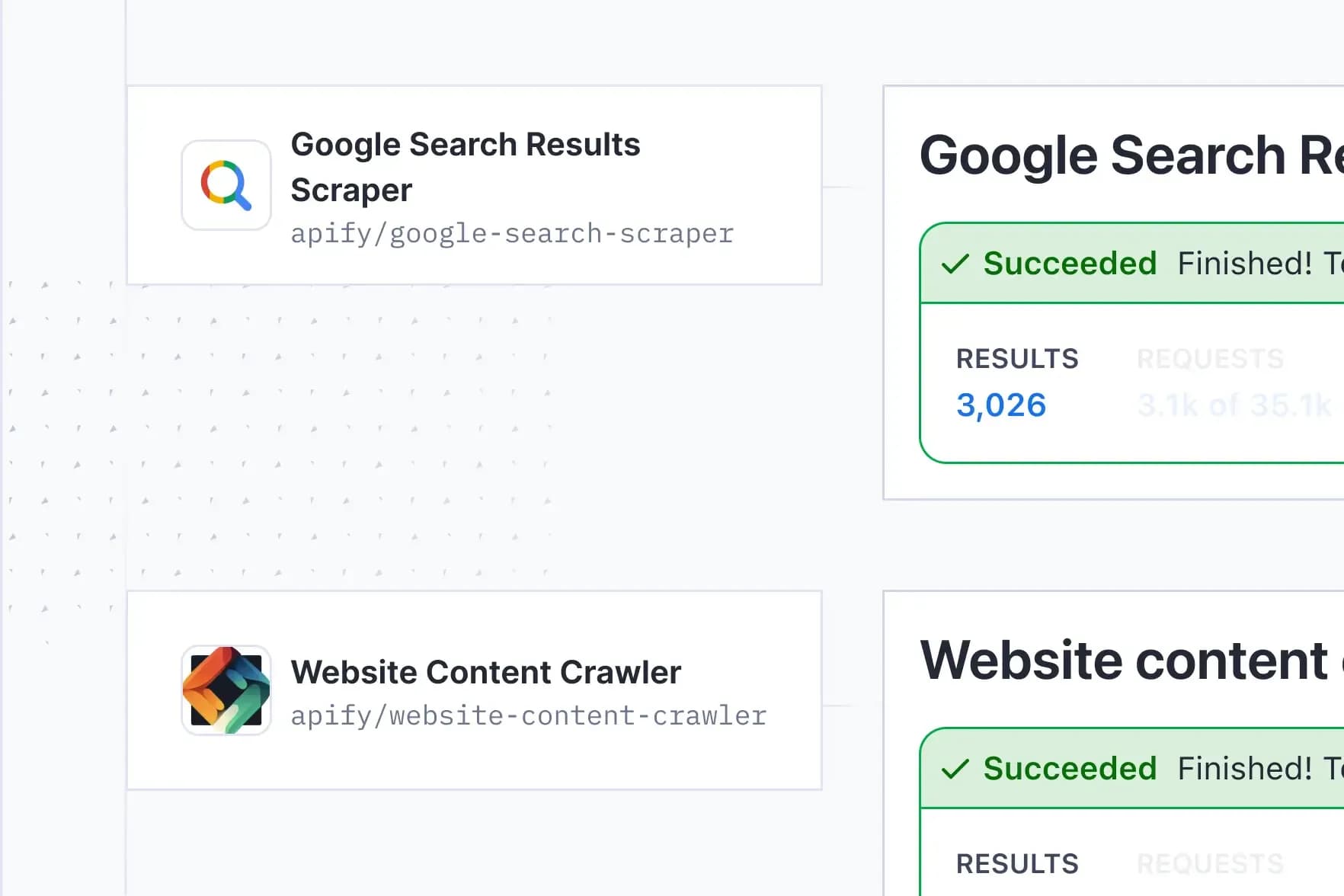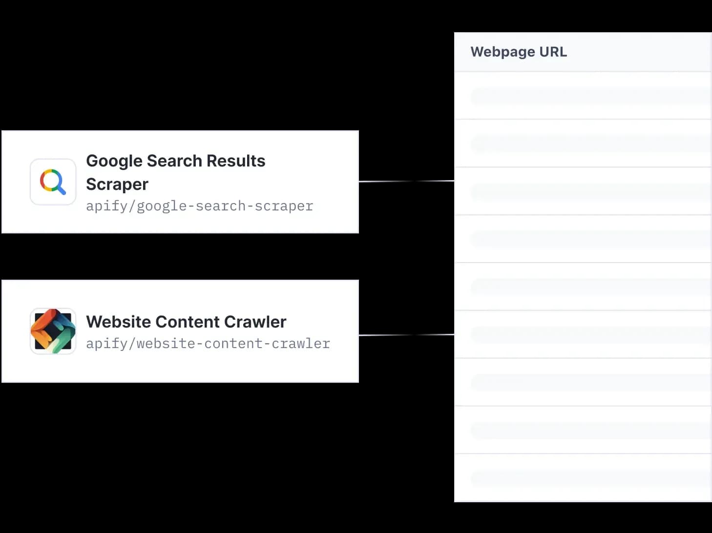 Collect large volumes of data across the web and transform it into insights with minimal effort. Google Search Results Scraper and Website Content Crawler will handle the complex tasks - no infrastructure concerns, no blocked requests, just results.