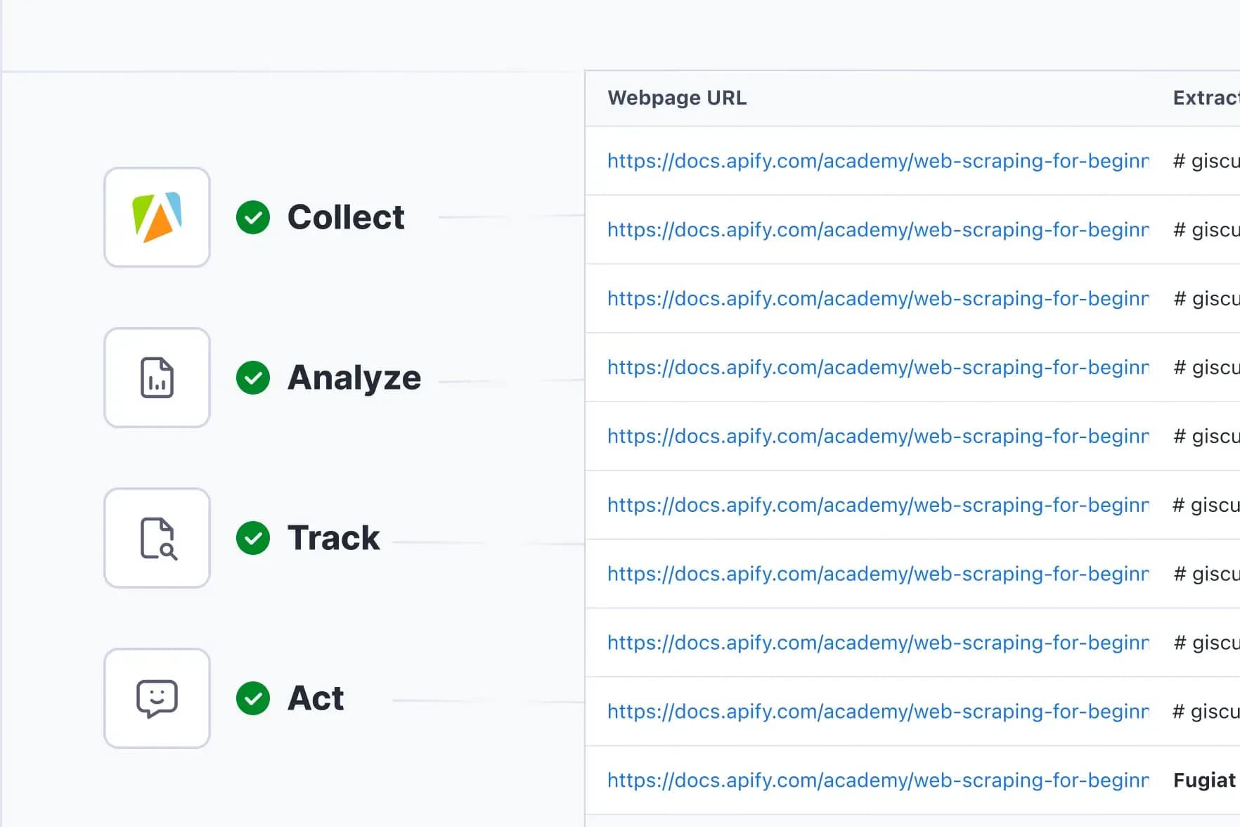 Gather, process, and analyze web data to stay ahead in your industry. With Apify Actors, you can monitor topics, track competitors, and extract market insights - without worrying about infrastructure or anti-scraping measures.
